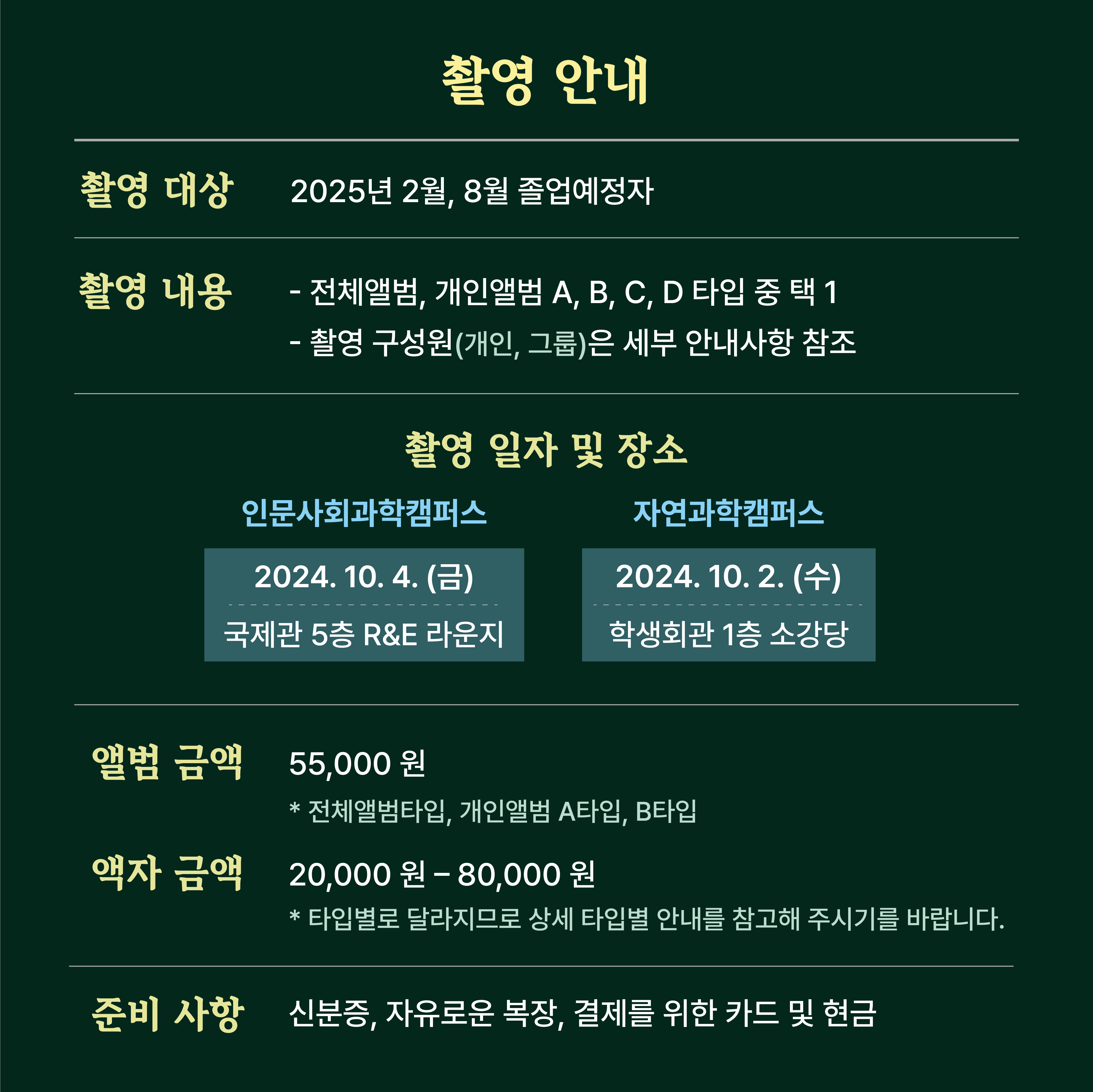 2024년 졸업앨범 최종 촬영과 관련하여 다음과 같이 안내드리오니 대상 학우분들께서는 참고해 주시기 바랍니다.