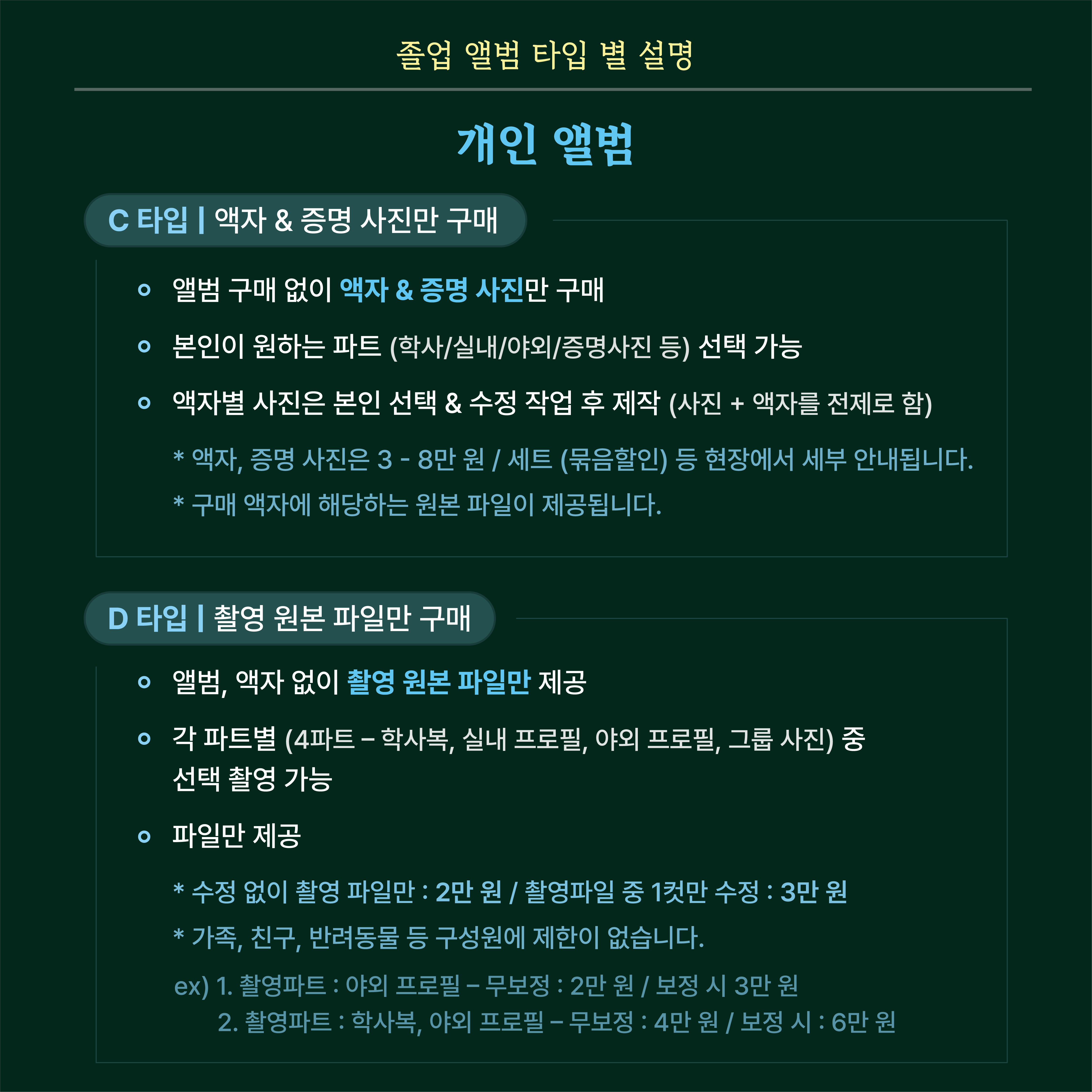 개인 앨범은 A,B,C,D 타입으로 세분화되어 개인의 기호에 맞는 앨범 혹은 액자의 촬영 및 제작이 가능하니 이 점 유의하시어 선택하여 주시기를 바랍니다.
