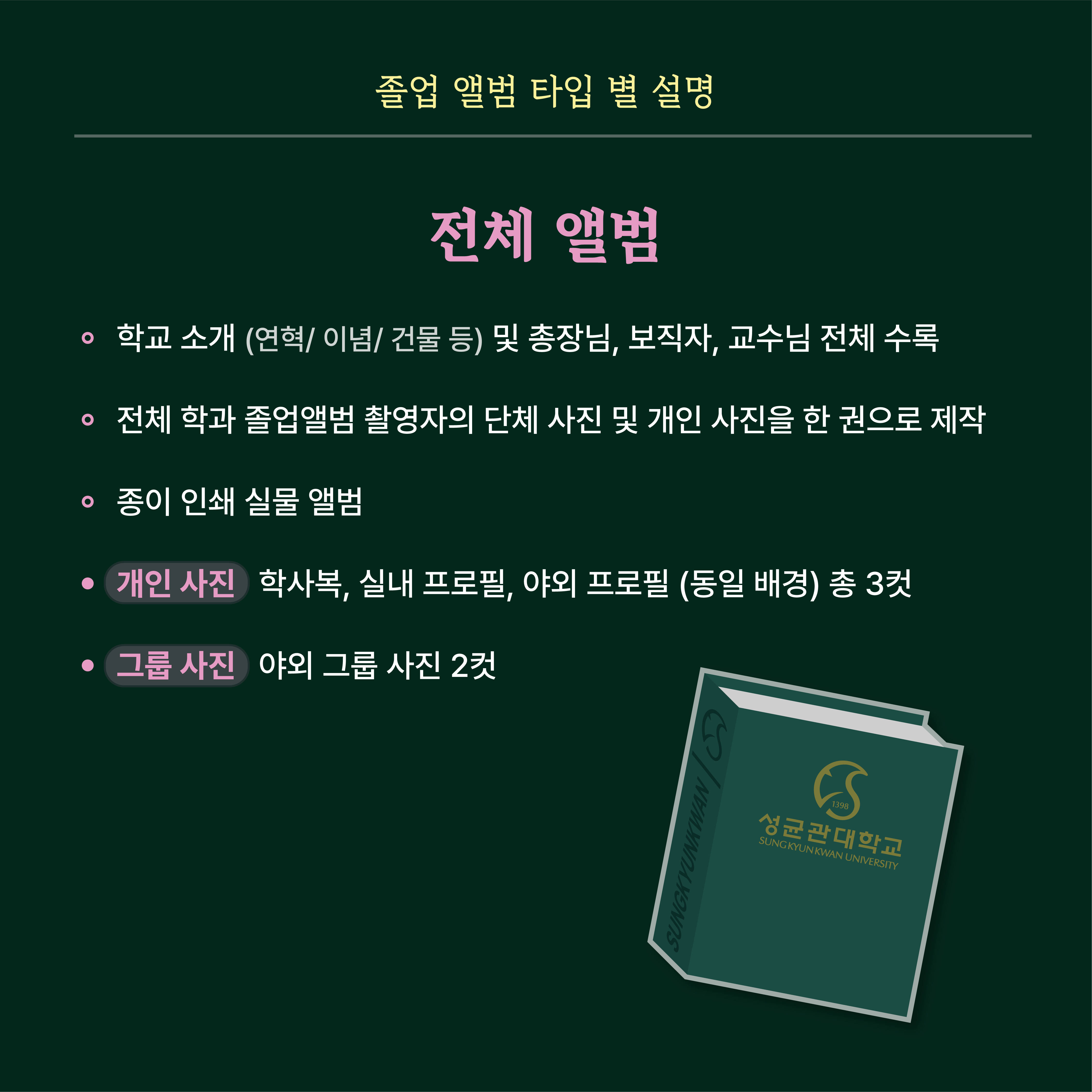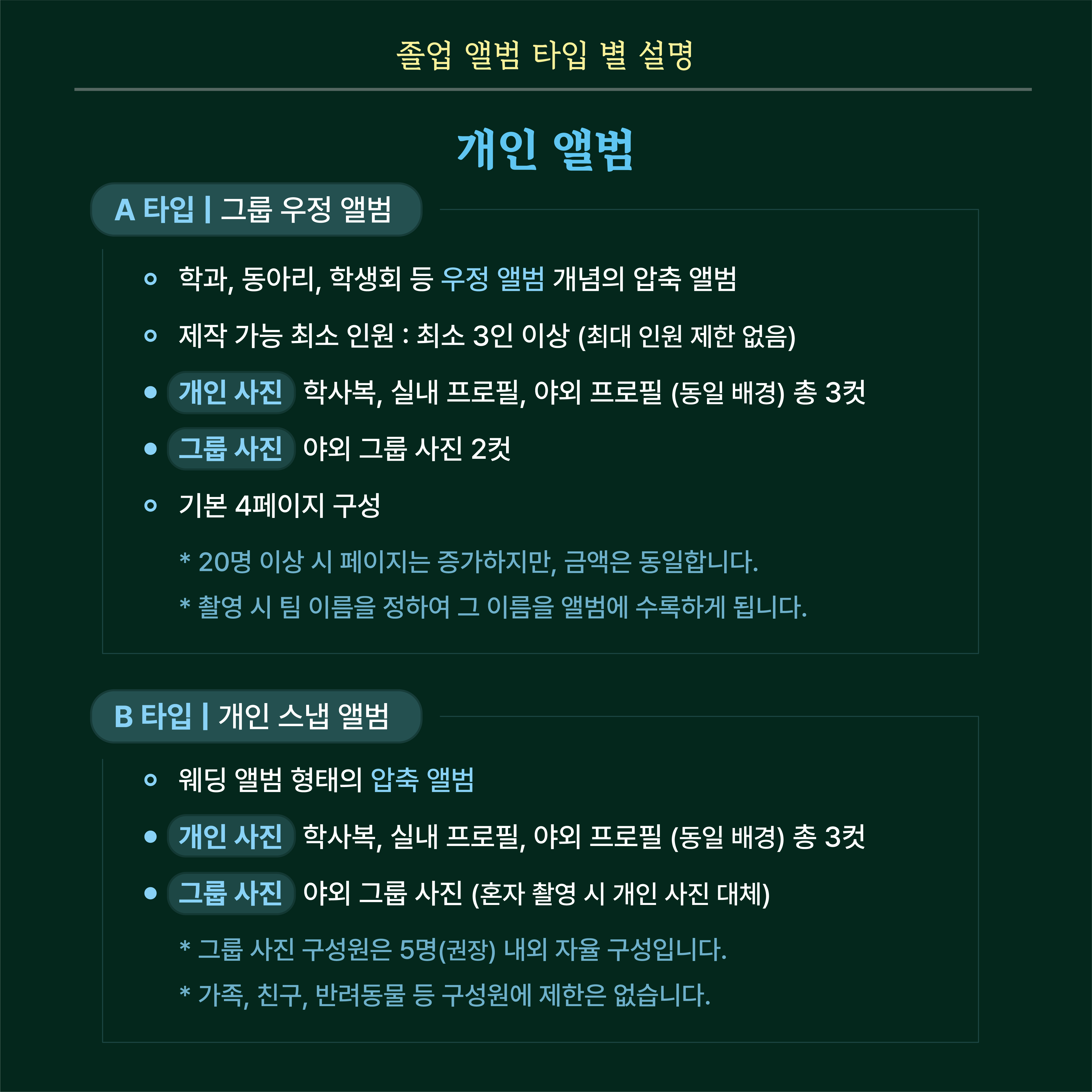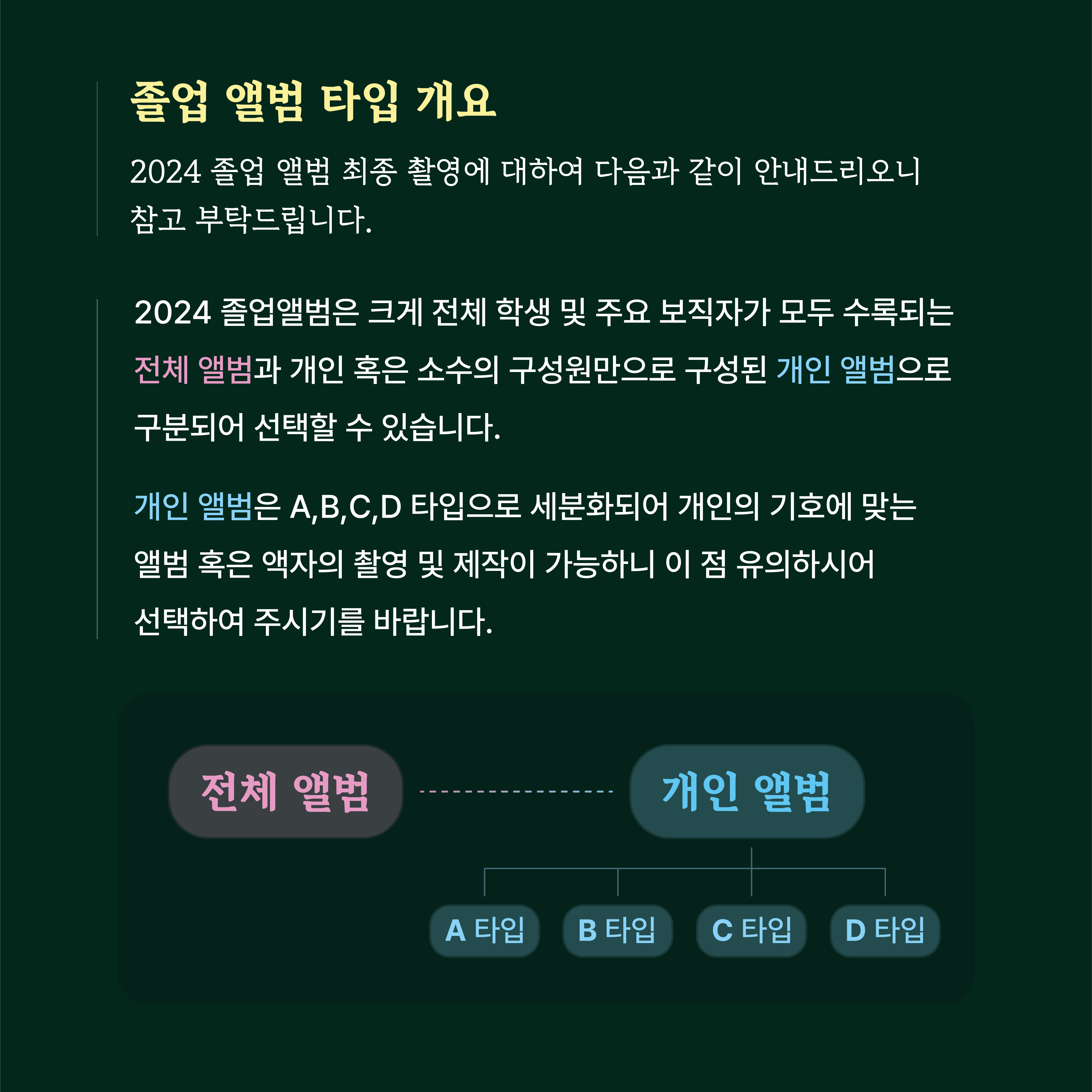 2024 졸업앨범은 크게 전체 학생 및 주요 보직자가 모두 수록되는 전체 앨범과 개인 혹은 소수의 구성원만으로 구성된 개인 앨범으로 구분되어 선택할 수 있습니다.