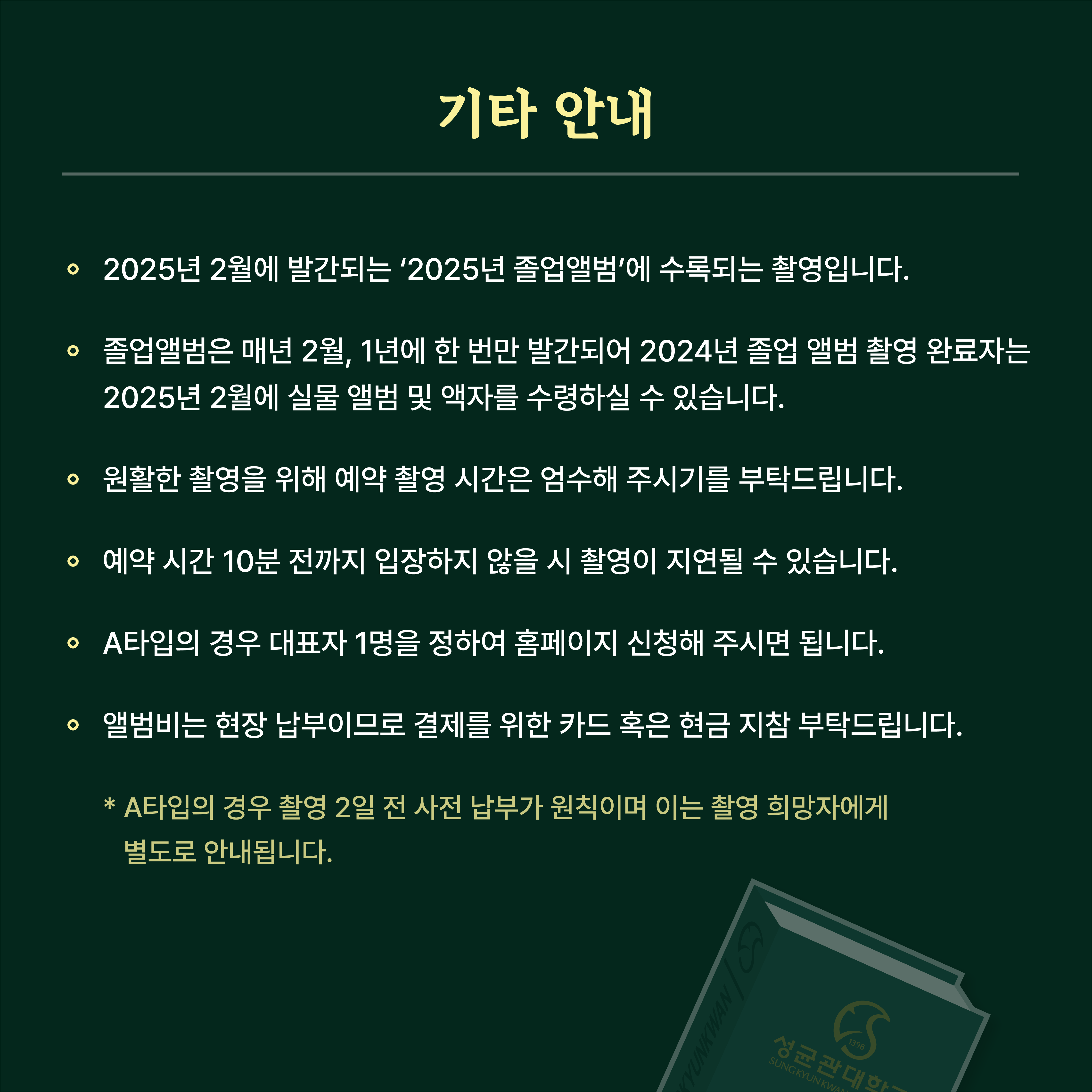 · 졸업앨범은 매년 2월, 1년에 한 번만 발간되어 2024년 졸업 앨범 촬영 완료자는 2025년 2월에 실물 앨범 및 액자를 수령하실 수 있습니다.
