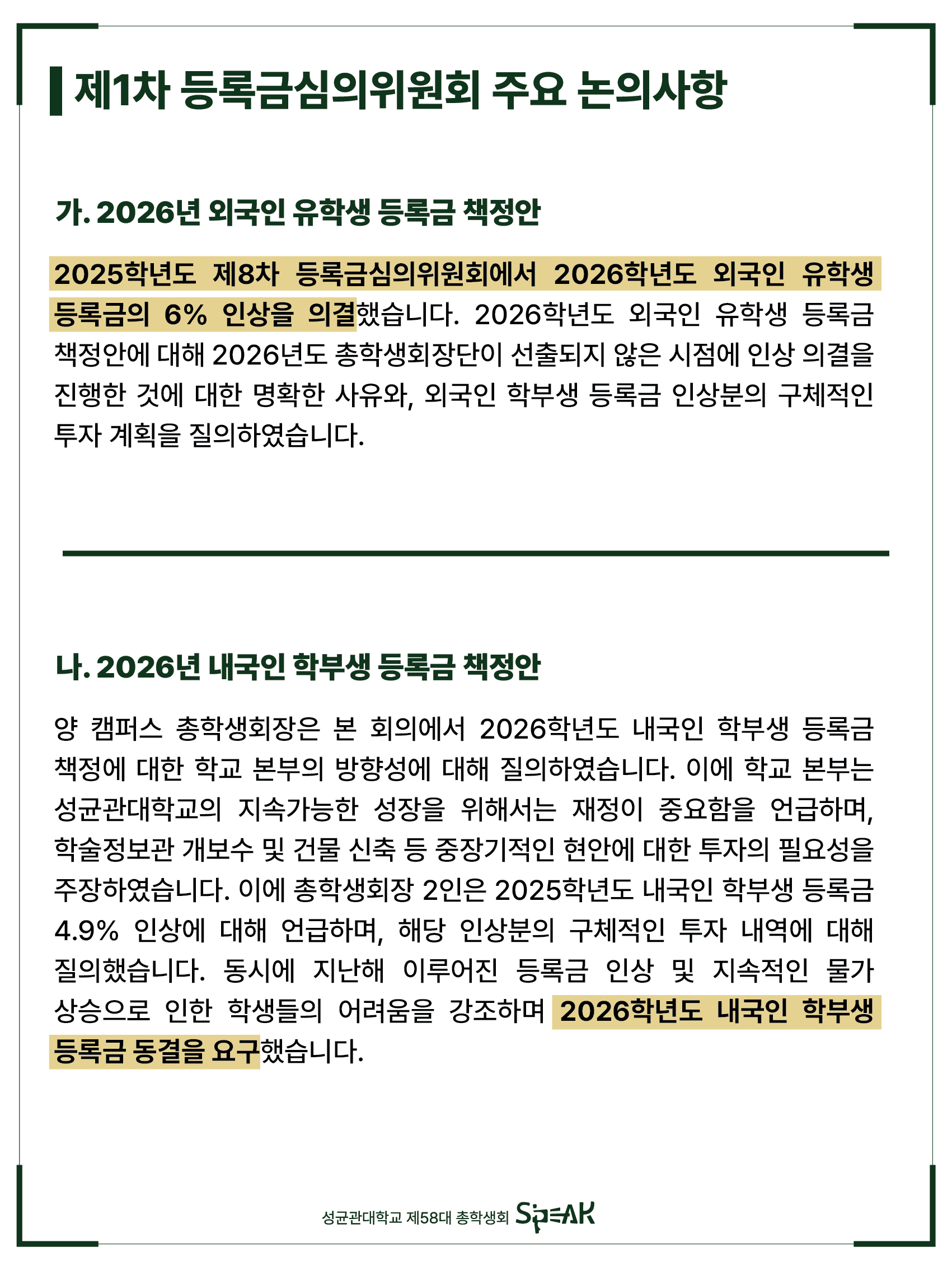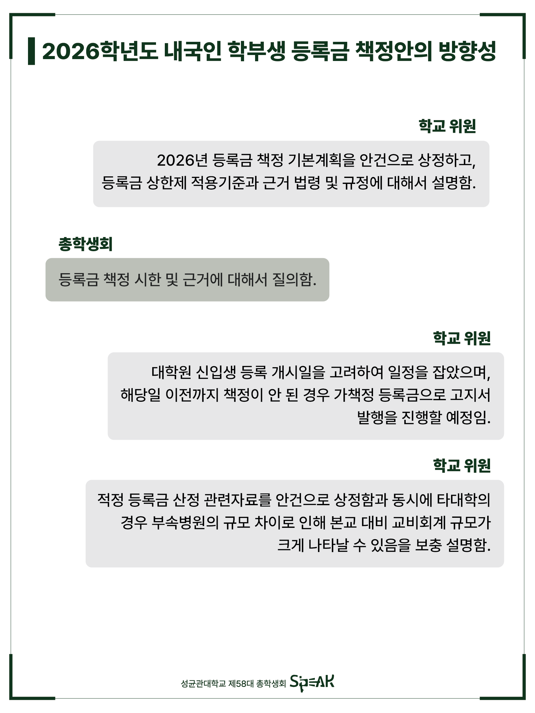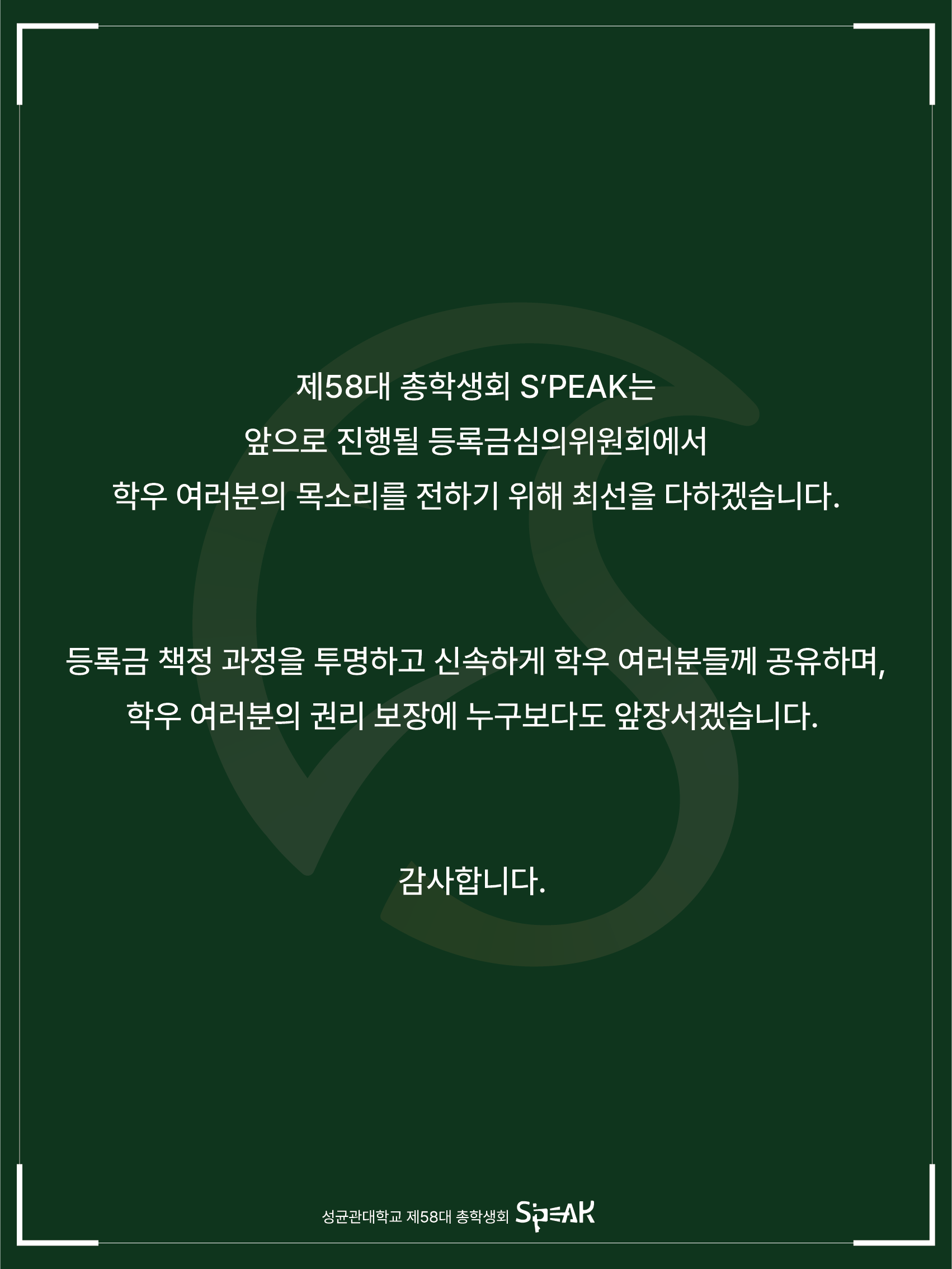 제58대 총학생회 S’PEAK는 앞으로 진행될 등록금심의위원회에서 학우 여러분의 목소리를 전하기 위해 최선을 다하겠습니다. 등록금 심의 과정을 투명하고 신속하게 학우 여러분들께 공유하며, 학우 여러분의 권리 보장에 누구보다도 앞장서겠습니다.