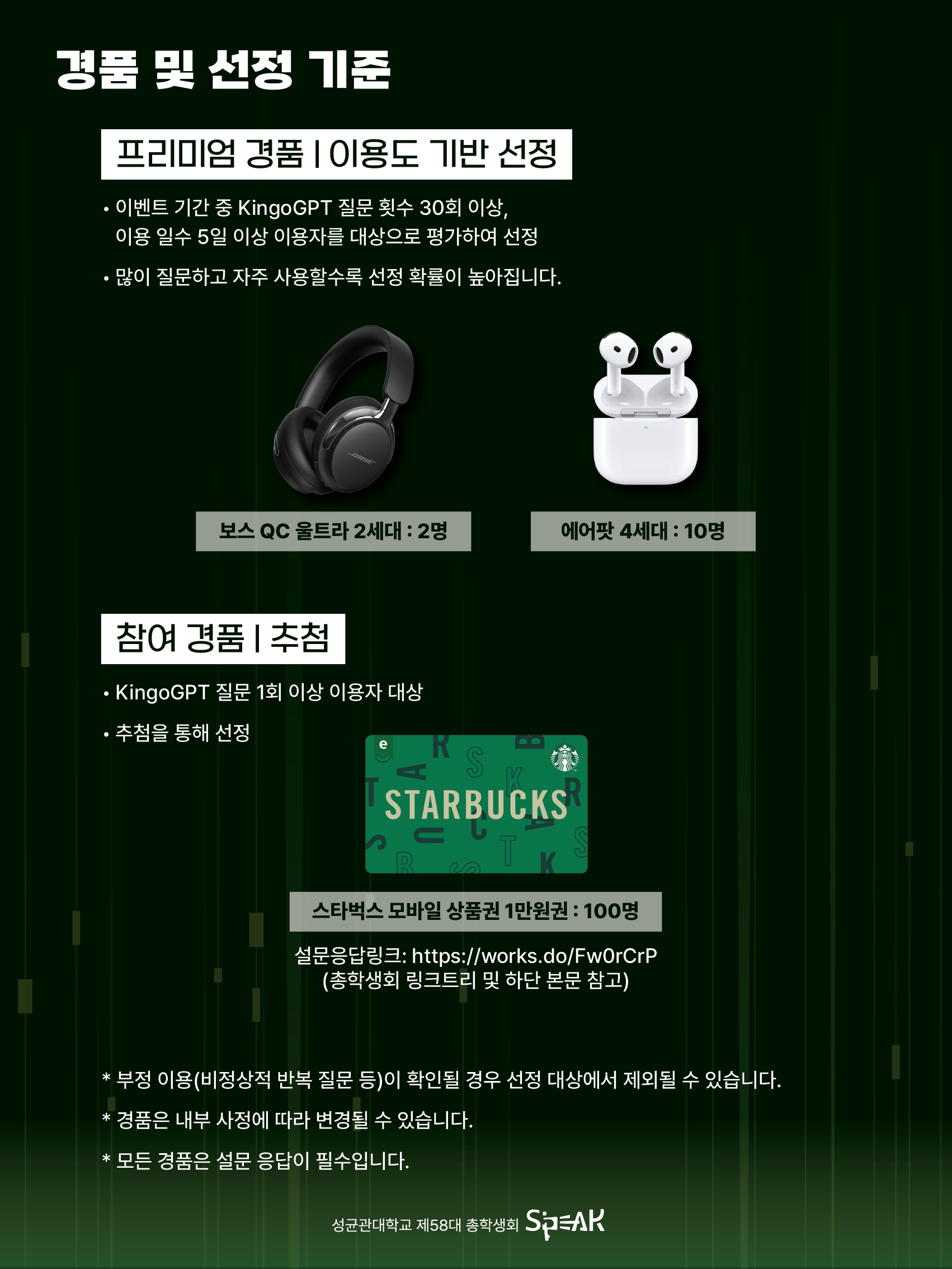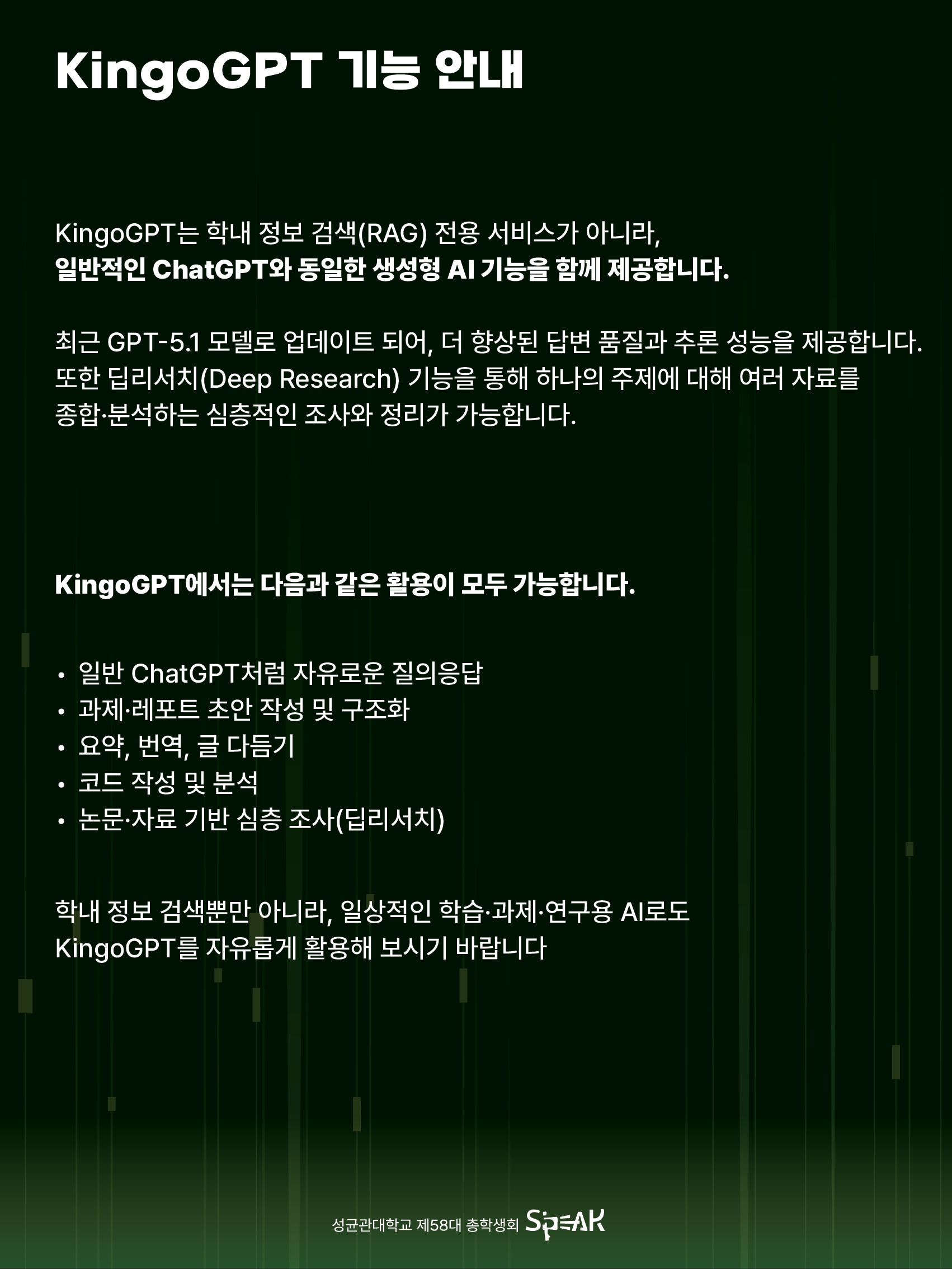 KingoGPT는 학내 정보 검색(RAG) 전용 서비스가 아니라, 일반적인 ChatGPT와 동일한 생성형 AI 기능을 함께 제공합니다. 성균관대학교 전용 AI 서비스 KingoGPT를 방학 기간 동안 더 많이, 더 폭넓게 활용해 보세요. 이벤트 기간 중 KingoGPT를 1회 이상 이용하고 설문 응답을 완료한 경우 이벤트 참여로 인정됩니다.