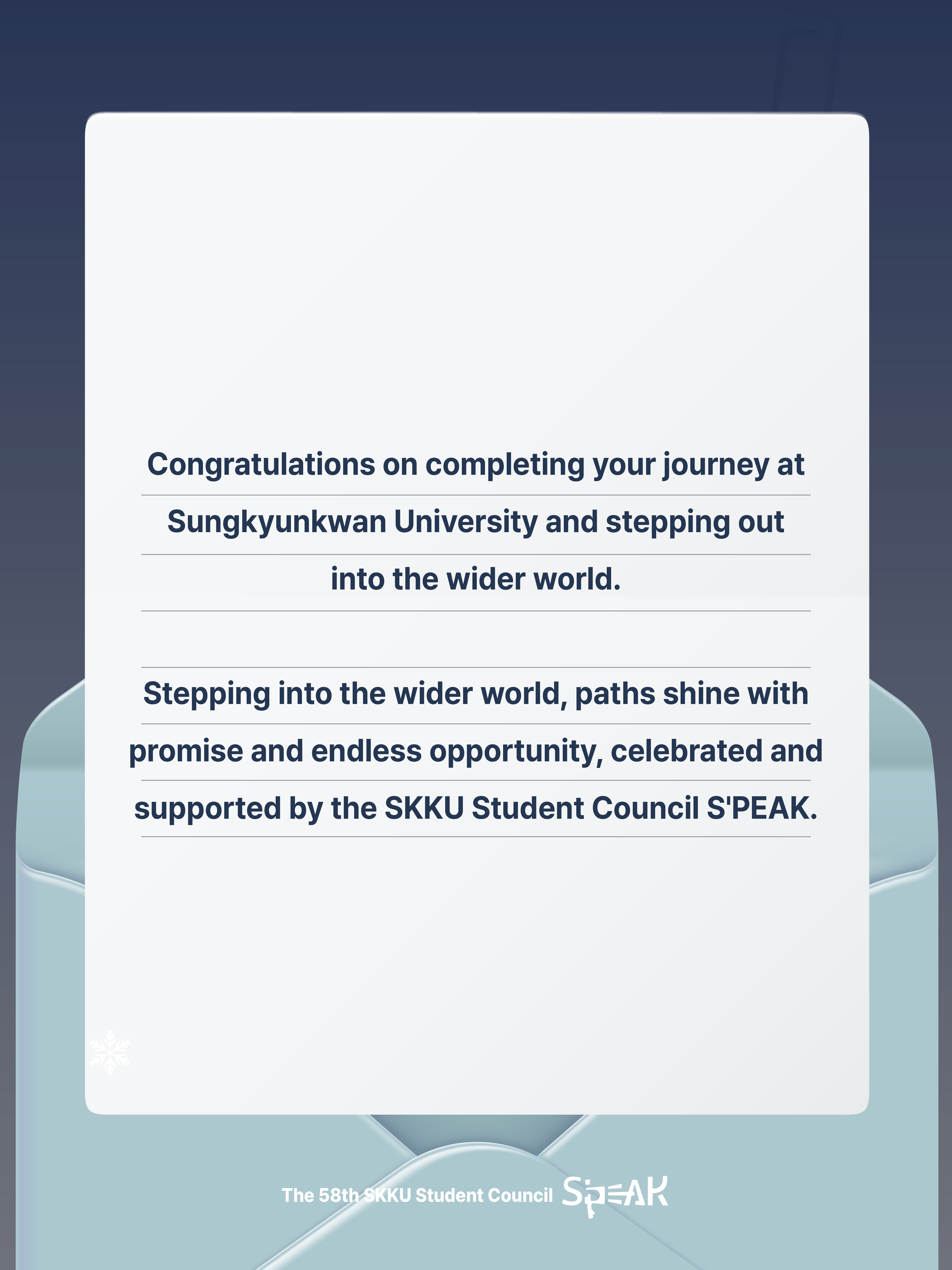 Congratulations on completing your journey at Sungkyunkwan University and stepping out into the wider world. Stepping into the wider world, paths shine with promise and endless opportunity, celebrated and supported by the SKKU Student Council S'PEAK.