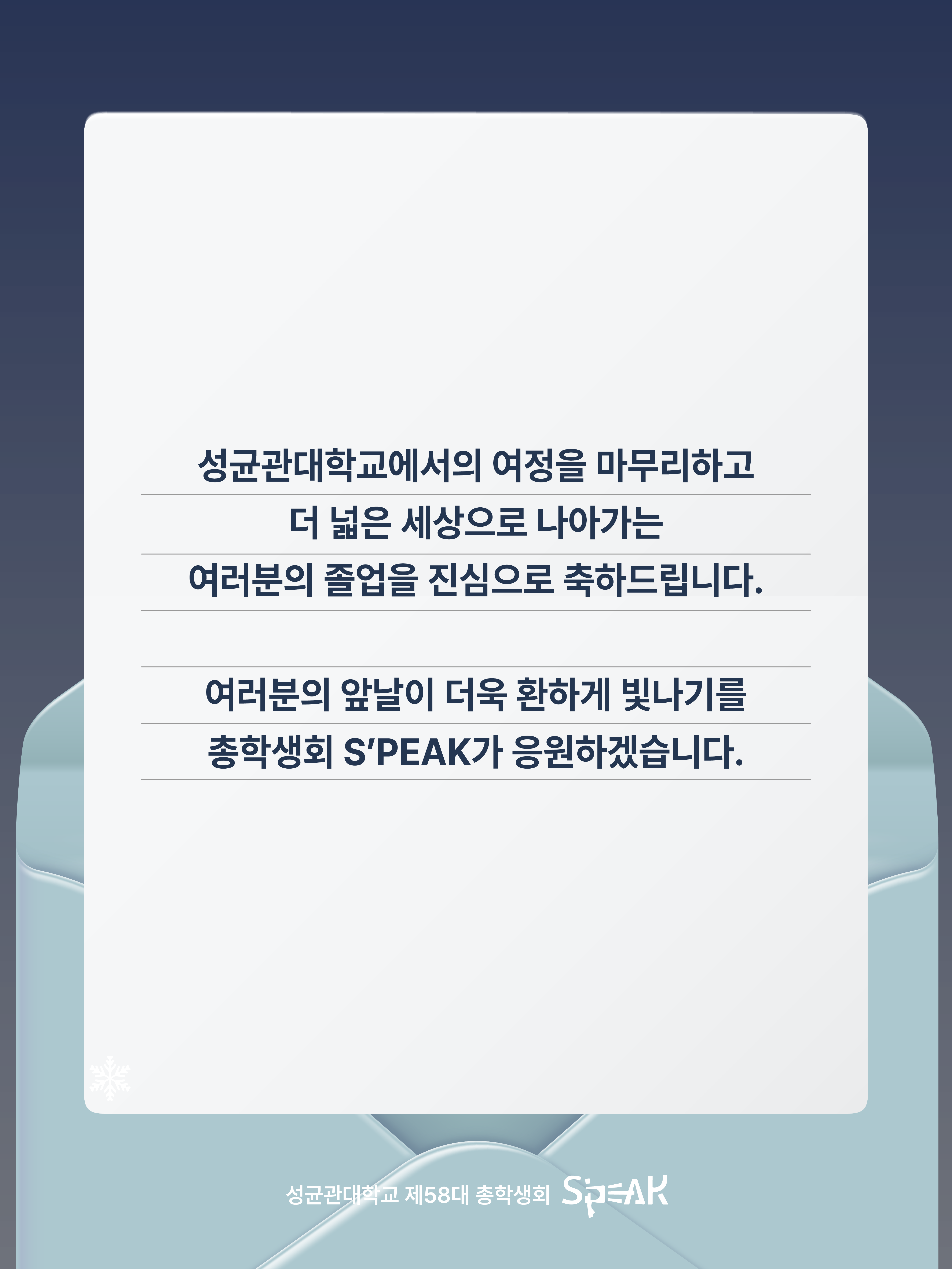 성균관대학교에서의 여정을 마무리하고 더 넓은 세상으로 나아가는 여러분의 졸업을 진심으로 축하드립니다. 여러분의 앞날이 더욱 환하게 빛나기를 총학생회 S’PEAK가 응원하겠습니다.