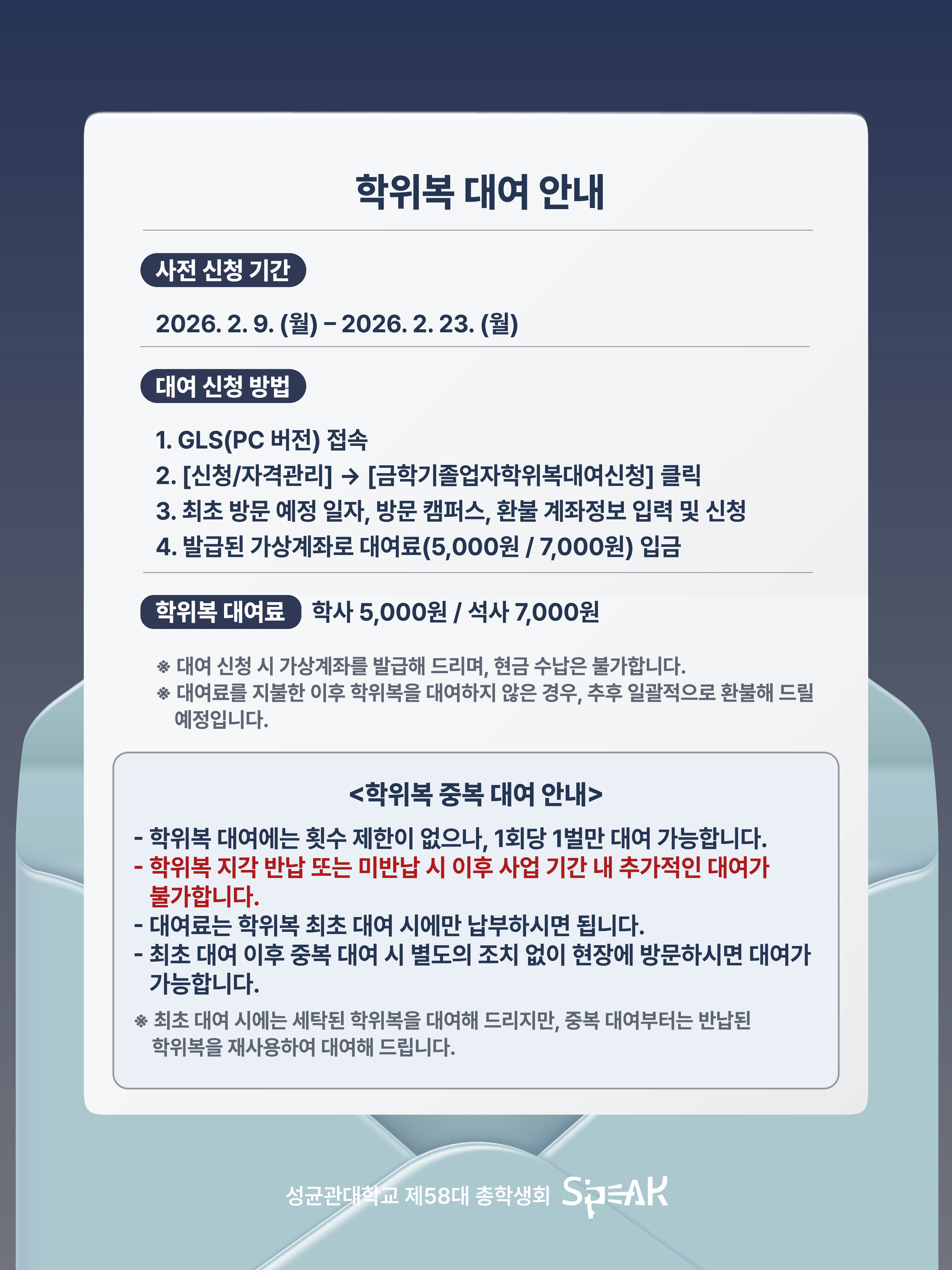 2026년도 동계 학위복 대여 사업을 다음과 같이 실시하오니 대상 학우분들께서는 일정에 참고하여 주시기 바랍니다.