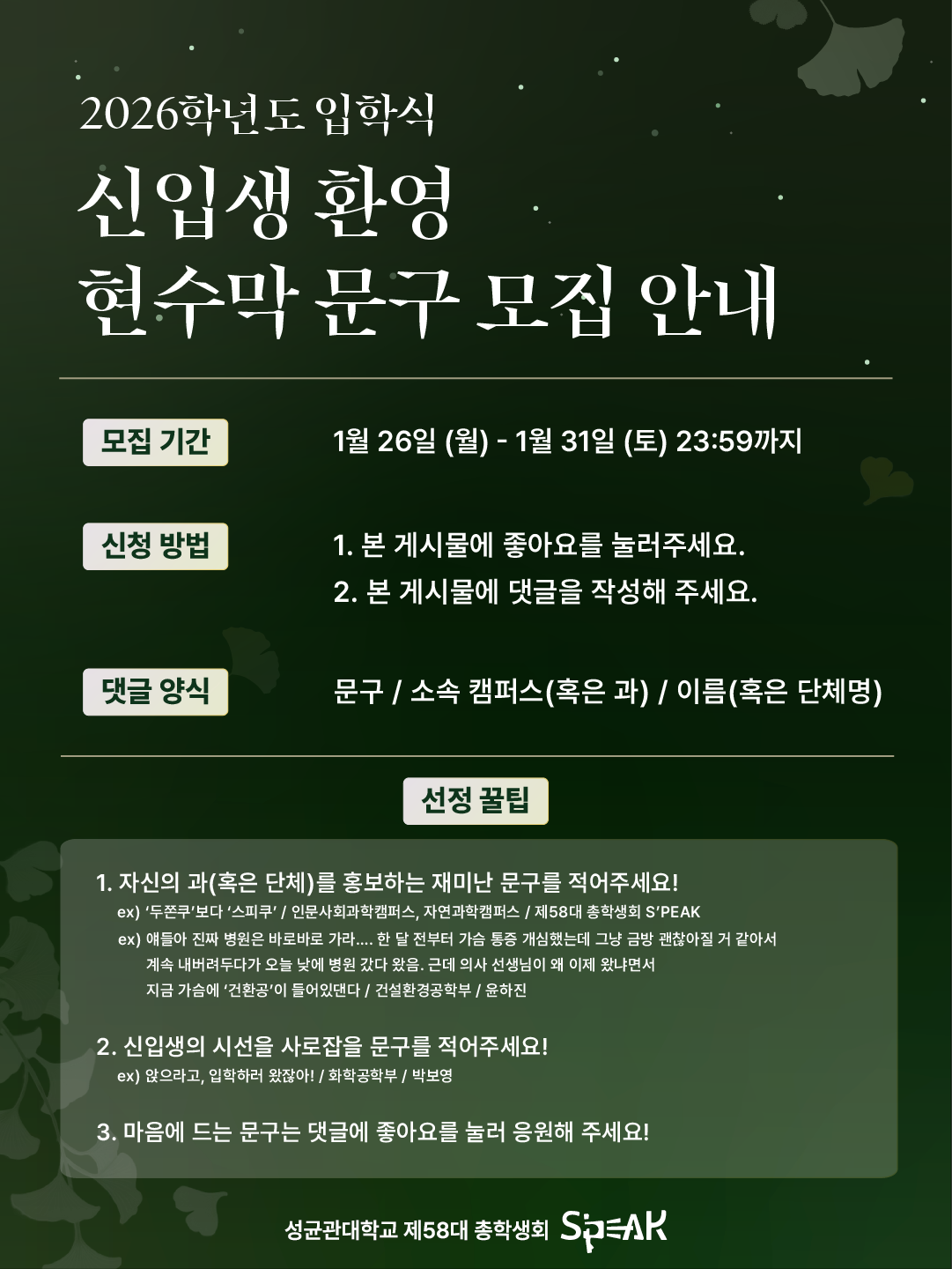 2026학년도 성균관대학교 입학식에 게시될 신입생 환영 현수막 문구를 모집합니다!