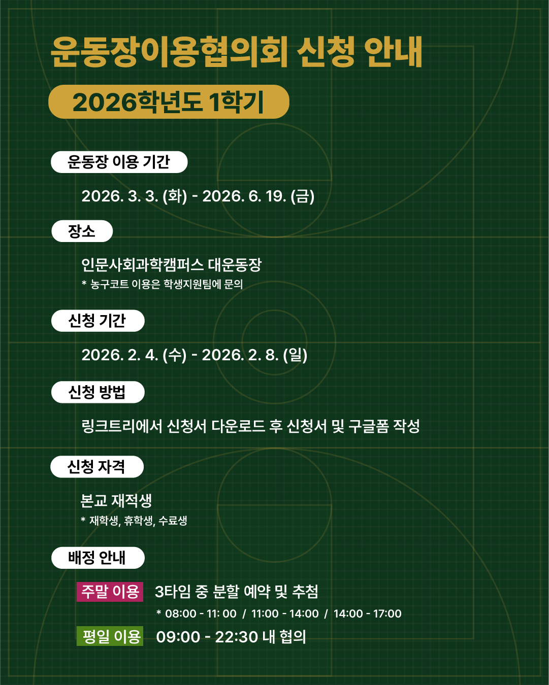 2026학년도 1학기 인문사회과학캠퍼스 운동장 평일/주말 사용 일정 배정을 아래와 같이 진행합니다. 운동장 사용을 희망하시는 학우분들께서는 안내 사항들을 참고하시어 신청해 주시기 바랍니다.