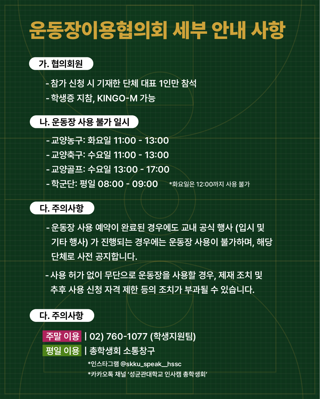 - Weekday use: SKKU Student Council communication channels (Instagram @skku_speak__hssc, KakaoTalk Channel Sungkyunkwan University HSSC Student Council)