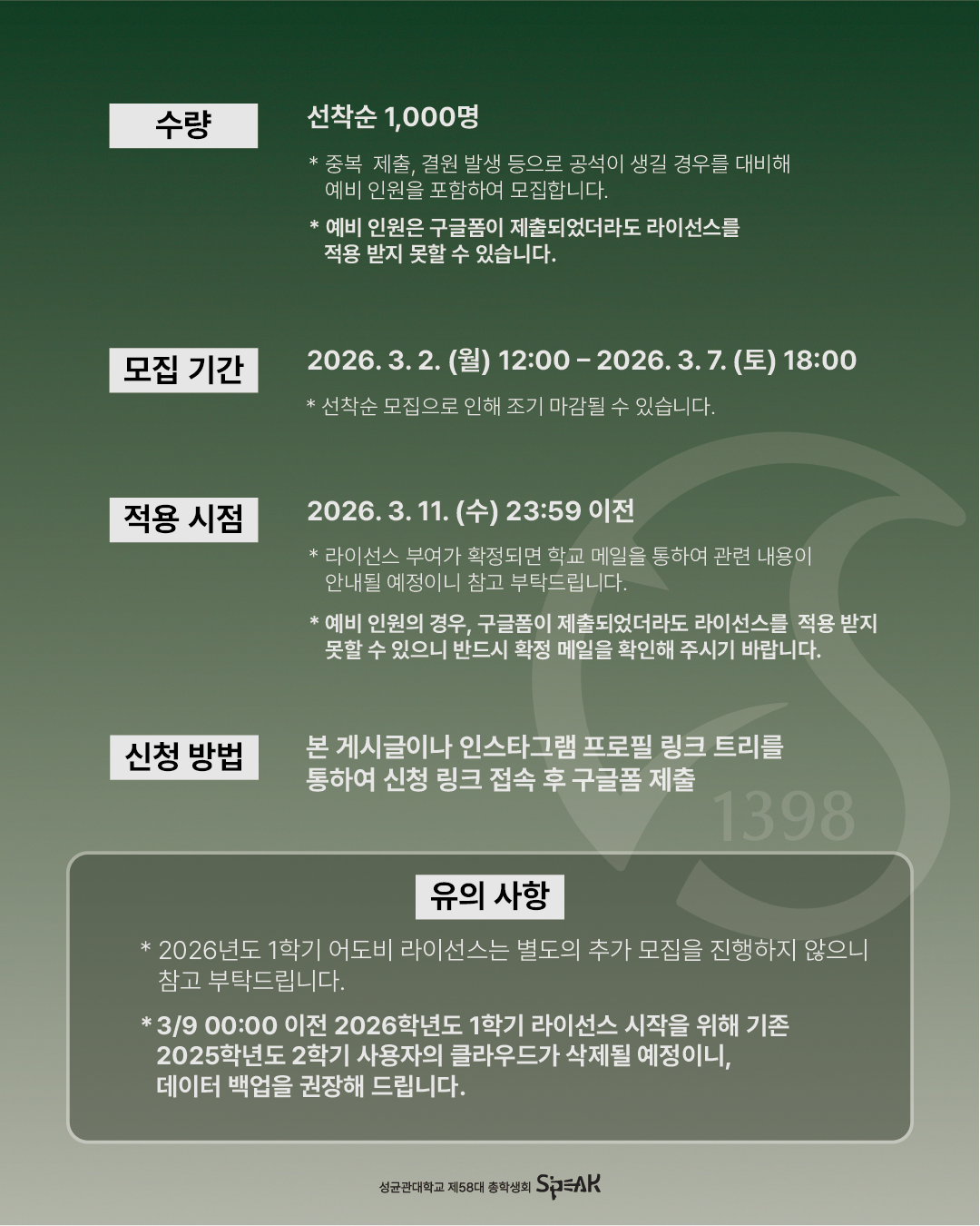 * Students from the School of Art are not eligible for this recruitment organized by the SKKU Student Council. Please refer to the School of Art Student Council's announcement for their separate Adobe license recruitment.