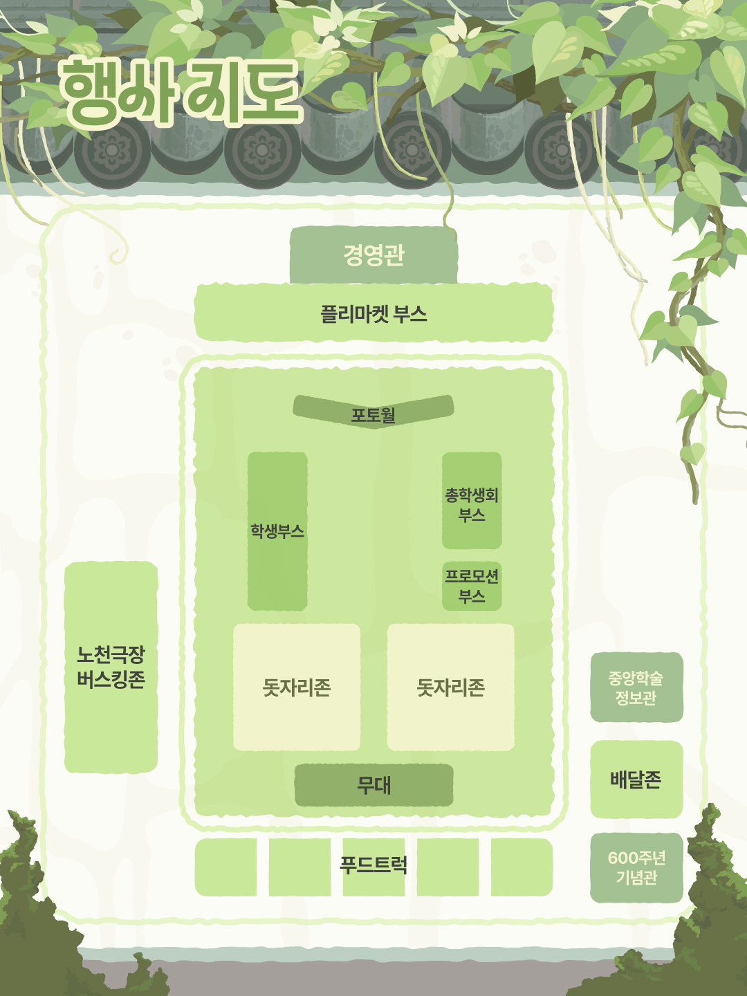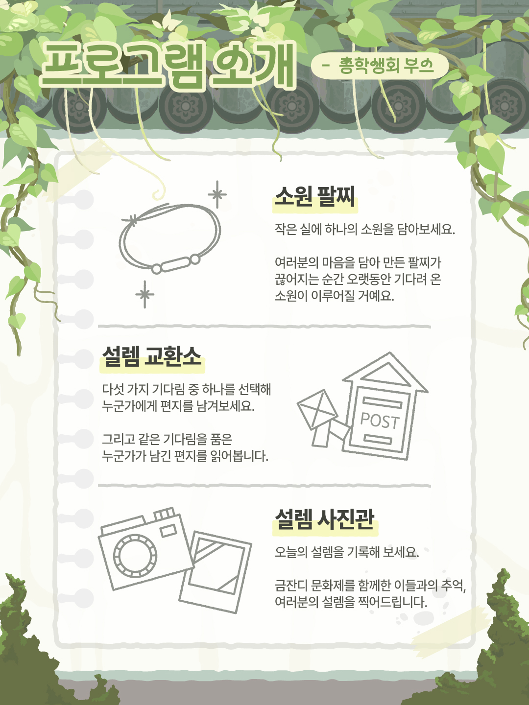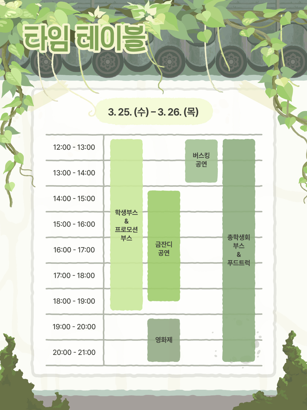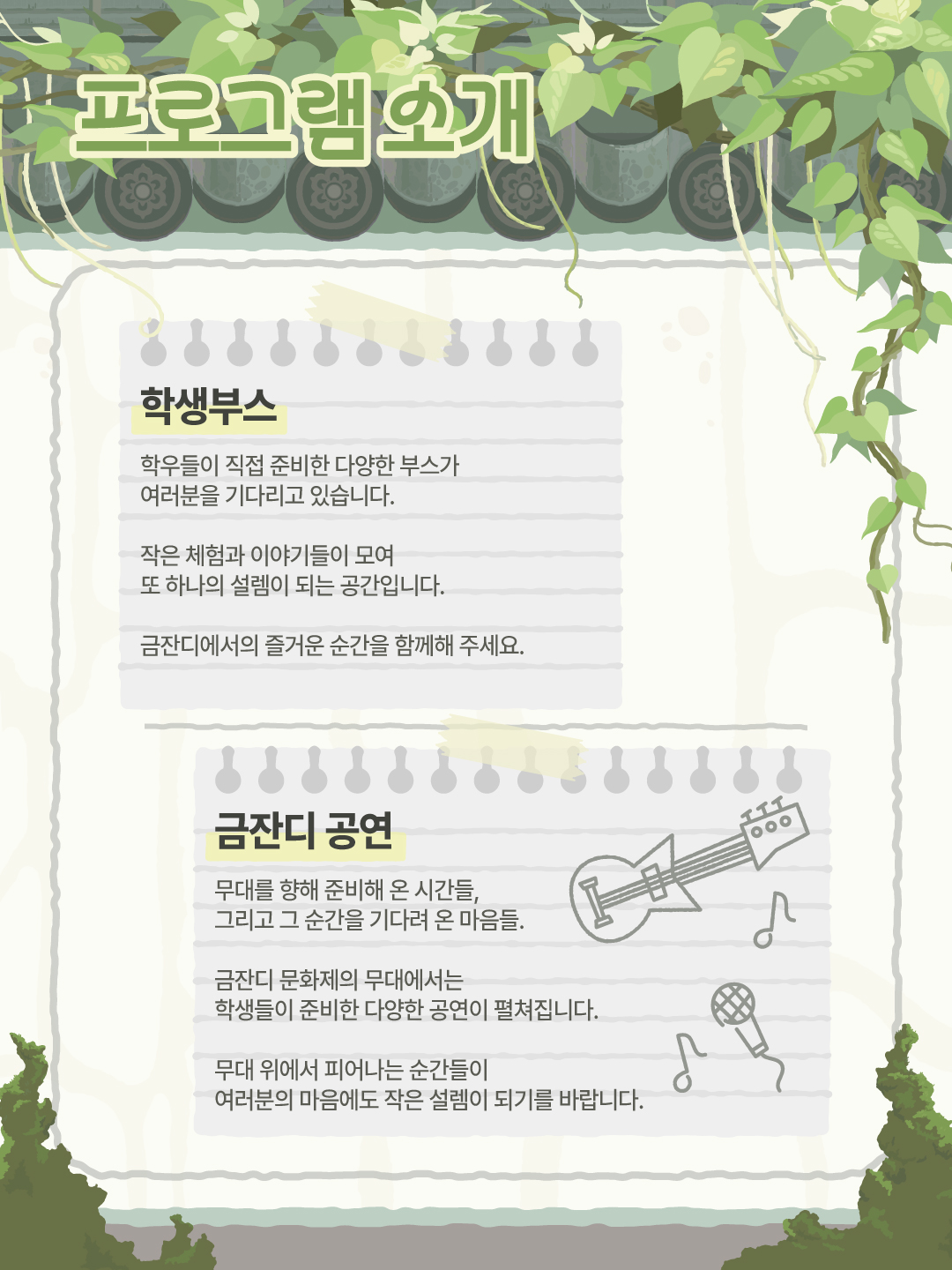 * 내용: 행사 지도, 타임 테이블, 학생부스, 버스킹 공연, 금잔디 공연, 영화제, 플리마켓, 프로모션, 푸드트럭 등