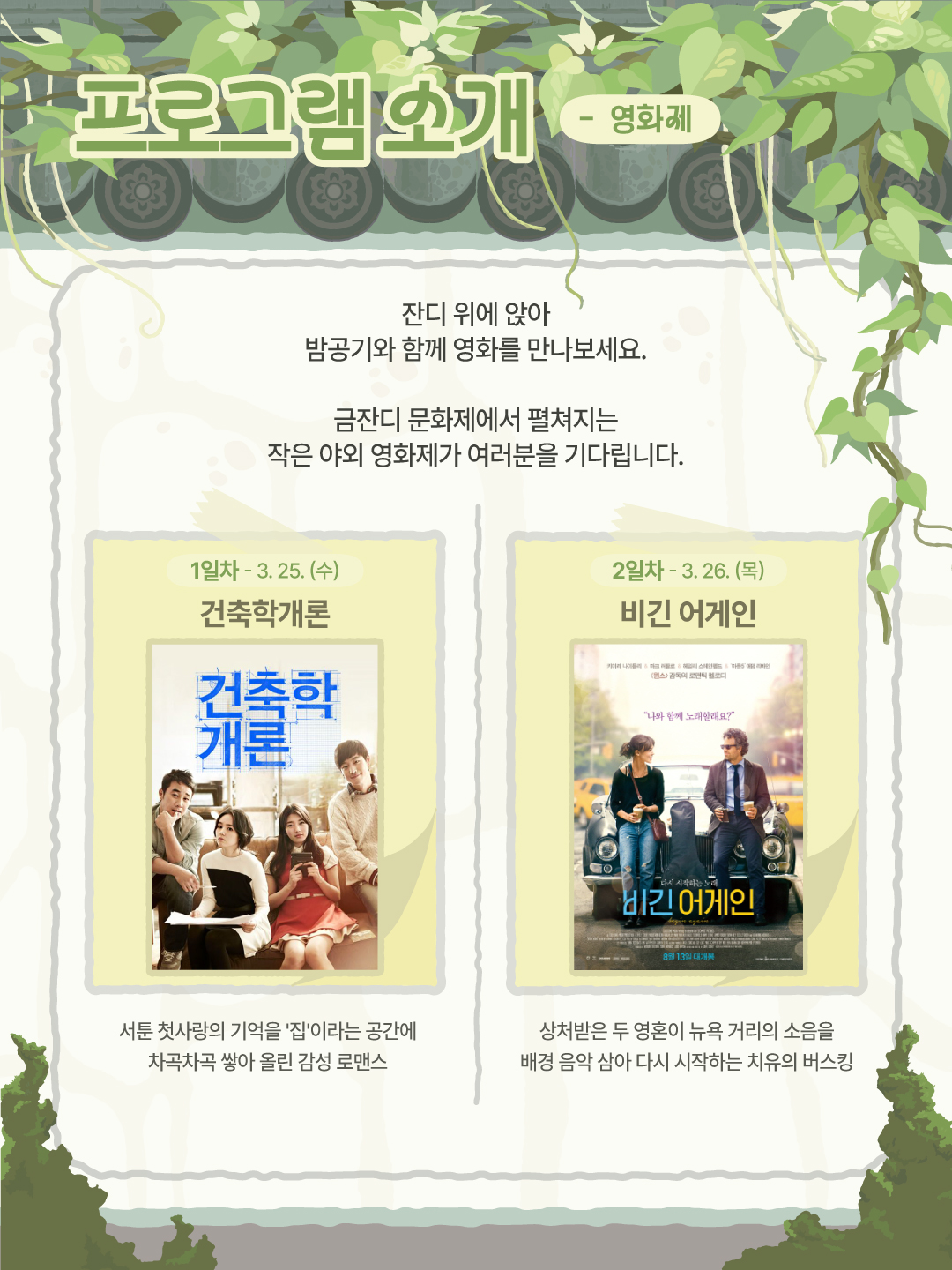 밤에는 금잔디에서 상영되는 낭만 넘치는 영화제까지 함께하실 수 있습니다!