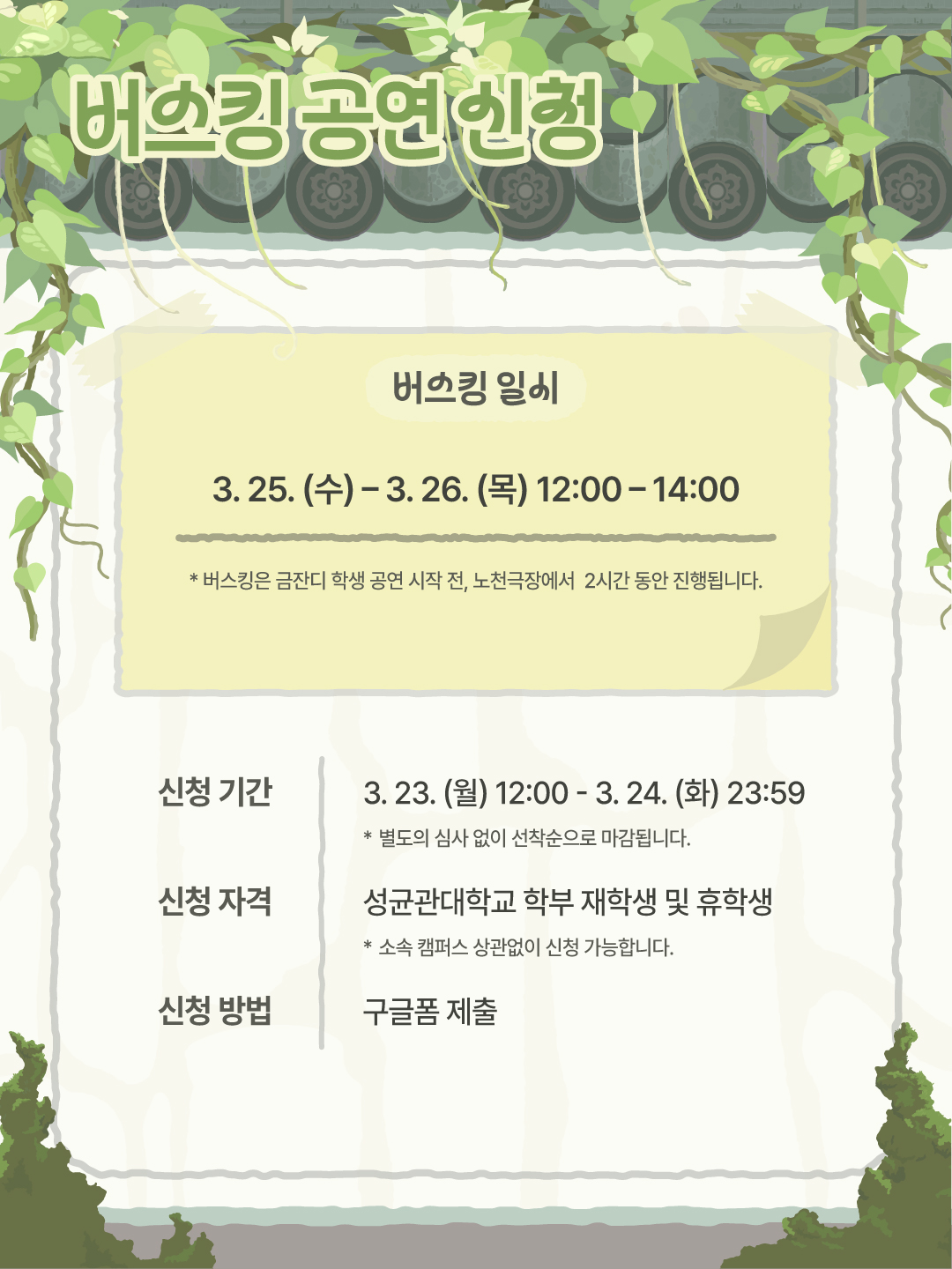 * 버스킹은 금잔디 학생 공연 시작 전, 노천극장(원형극장)에서 2시간 동안 진행됩니다.