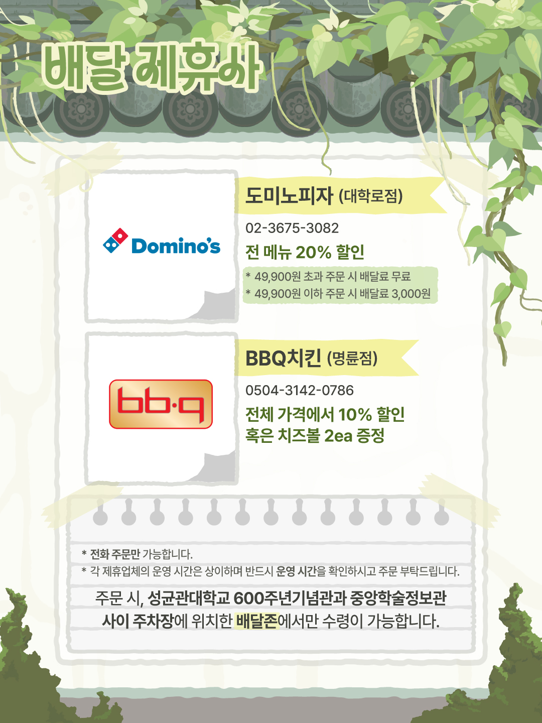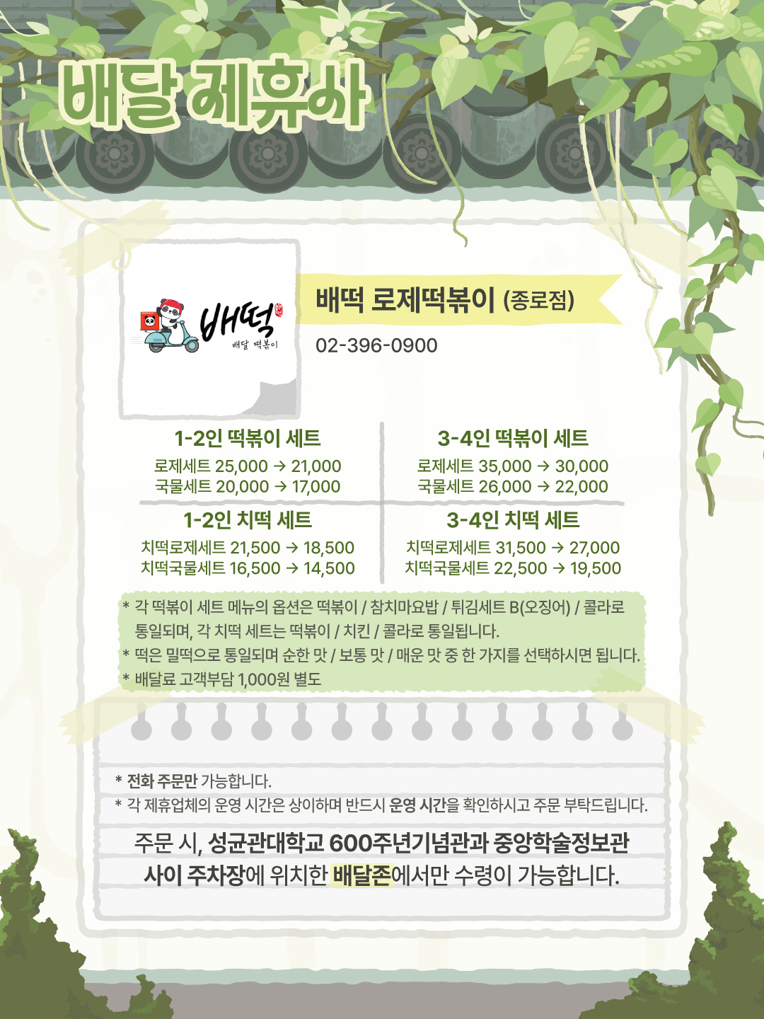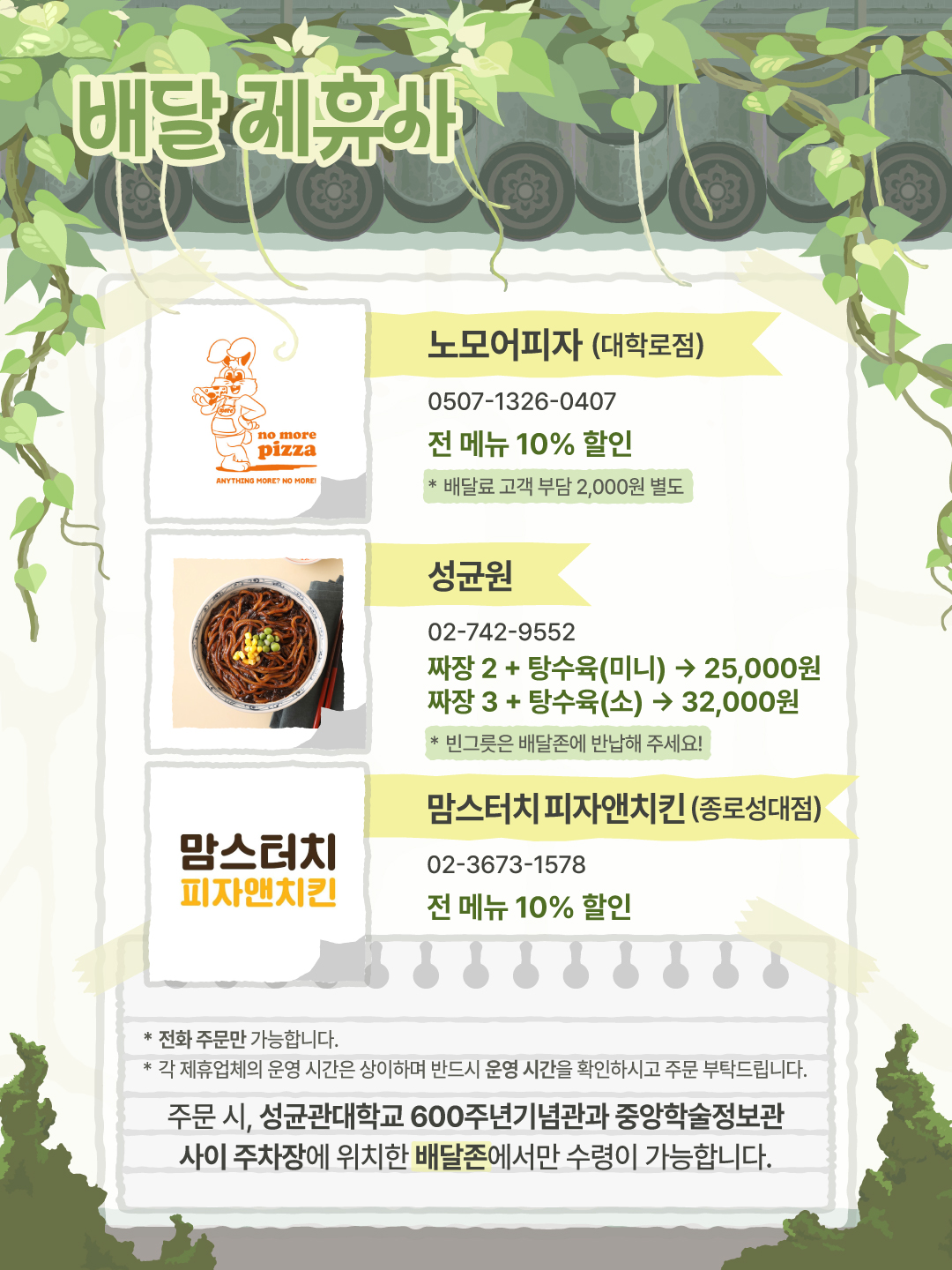 * 주문 시, ‘성균관대학교 600주년기념관과 중앙학술정보관 사이 주차장’에 위치한 배달존에서만 수령이 가능합니다.