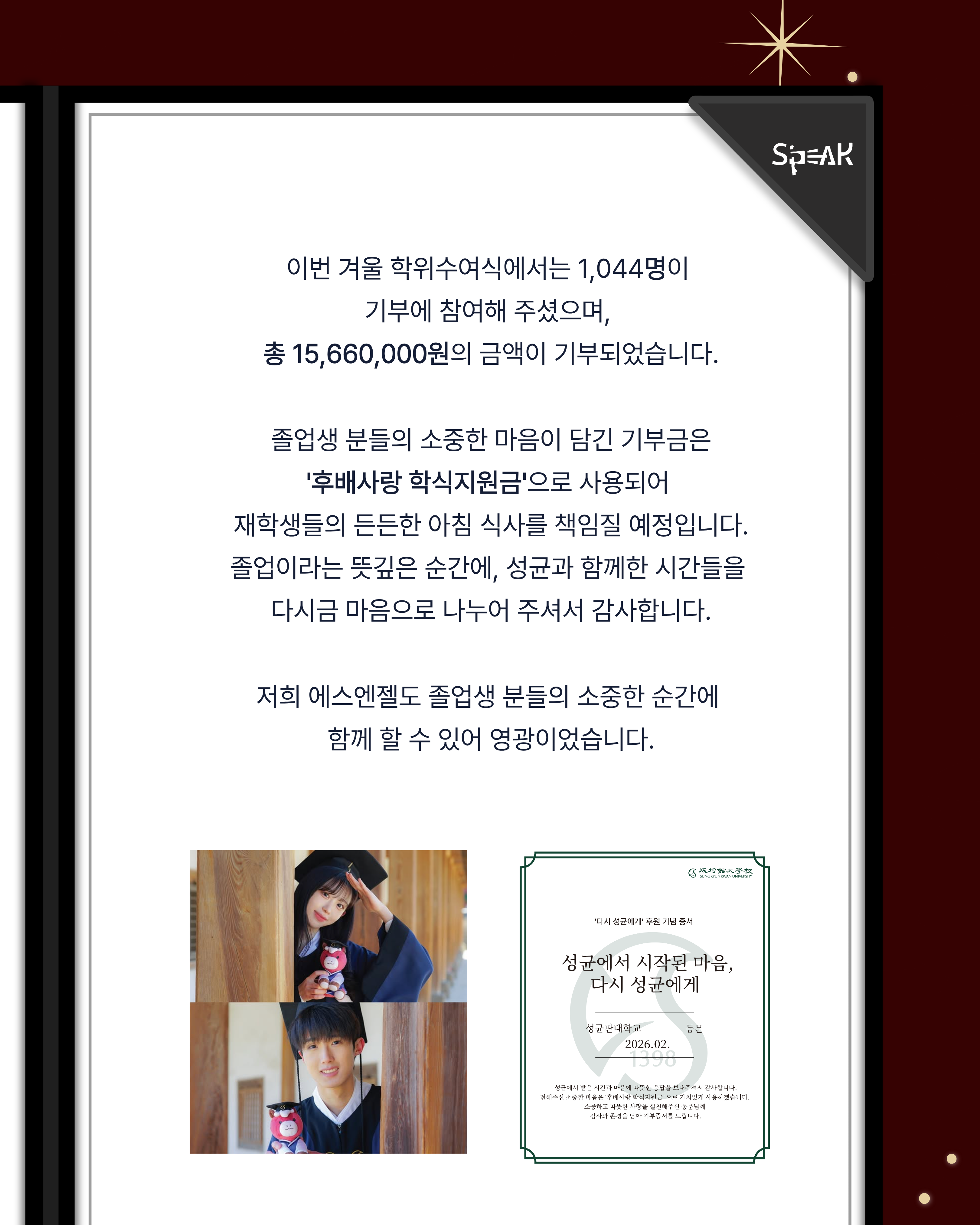 The 'Once more, to Sungkyunkwan' campaign, held for the second time following last year, was prepared for graduating students in the Year of the Red Horse 2026. It invited reflection on meaningful moments at Sungkyunkwan and encouraged turning those memories into giving.