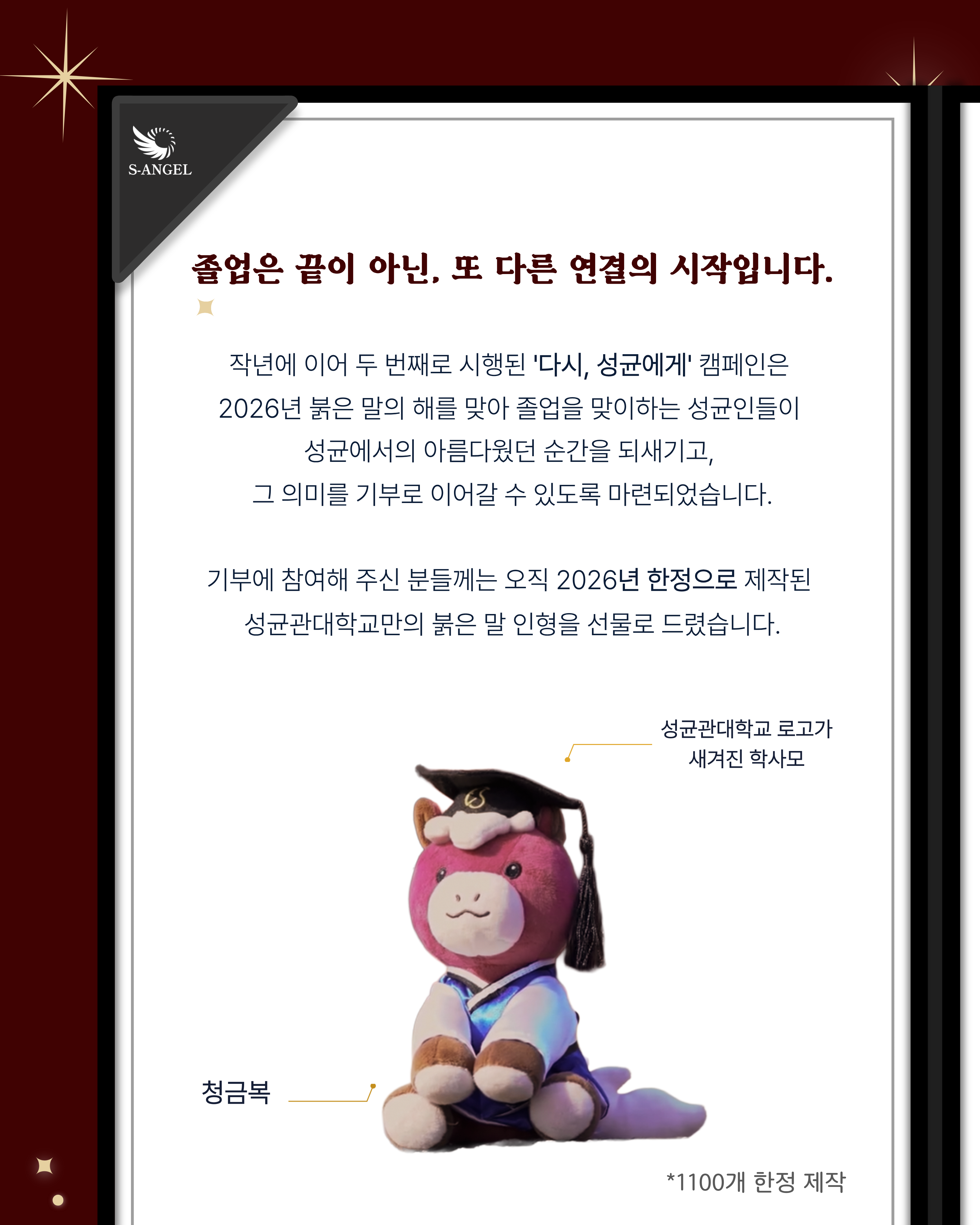 작년에 이어 두 번째로 시행된 '다시, 성균에게' 캠페인은 2026년 붉은 말의 해를 맞아 졸업을 맞이하는 성균인들이 성균에서의 아름다웠던 순간을 되새기고, 그 의미를 기부로 이어갈 수 있도록 마련되었습니다.