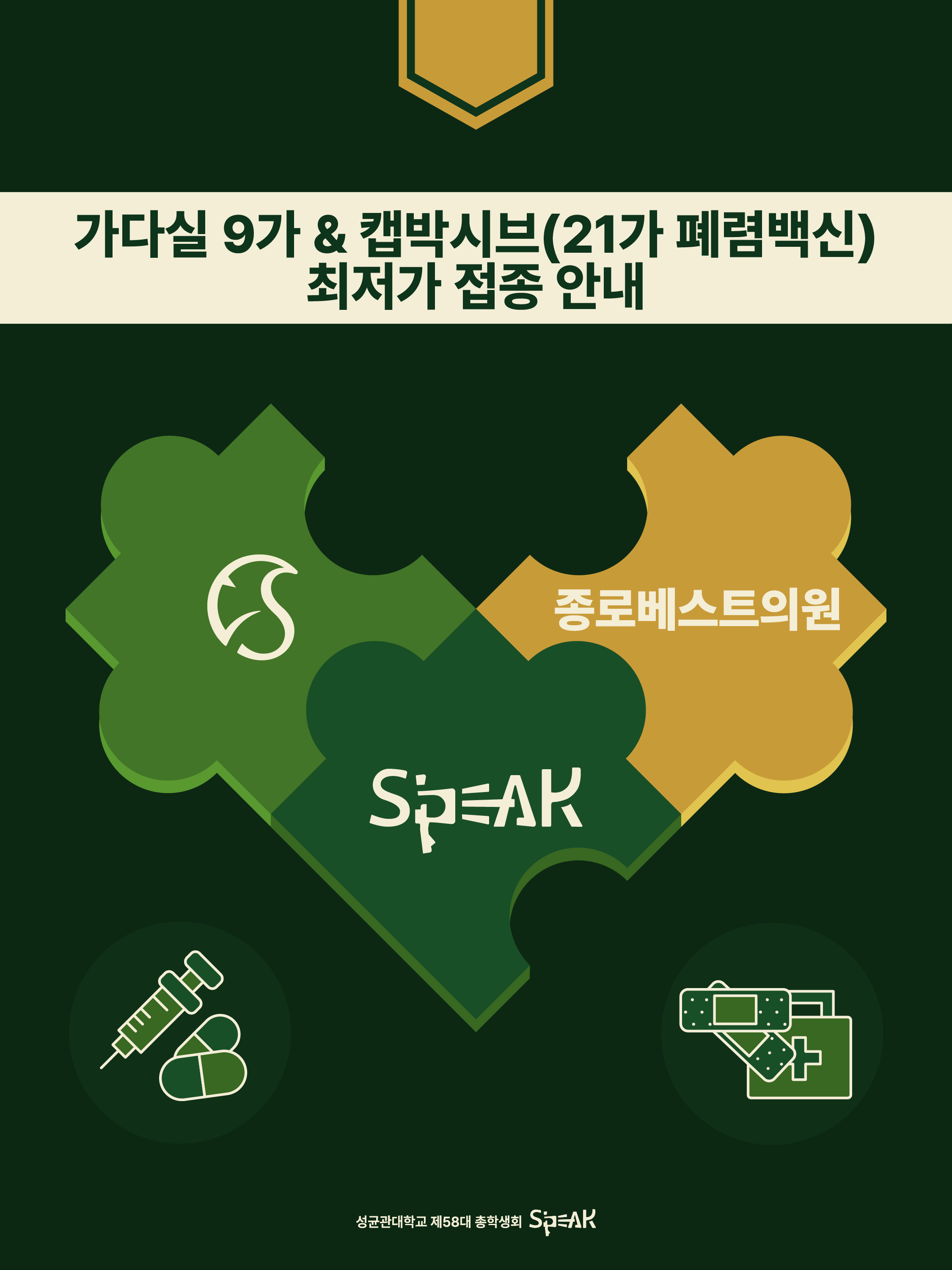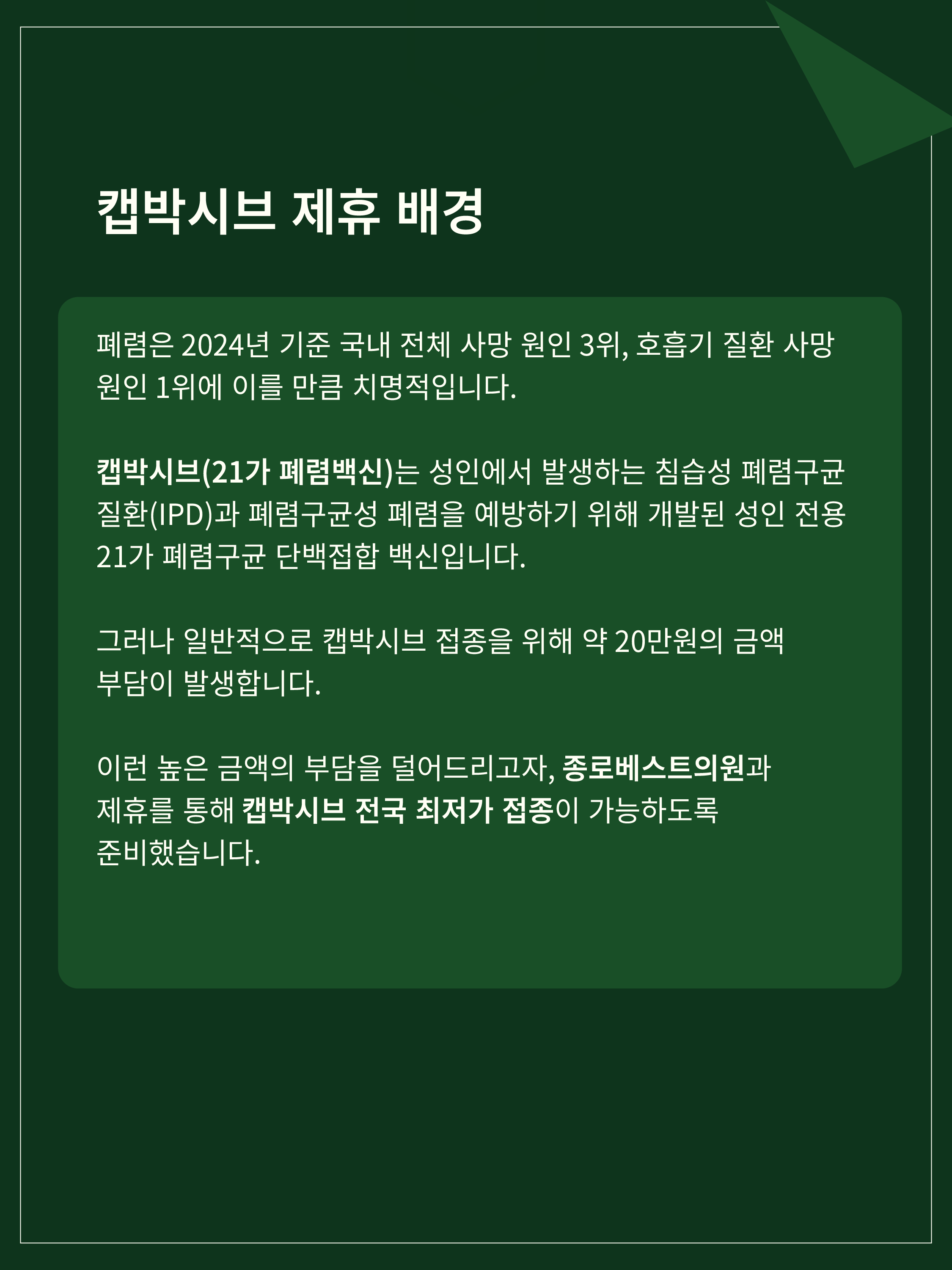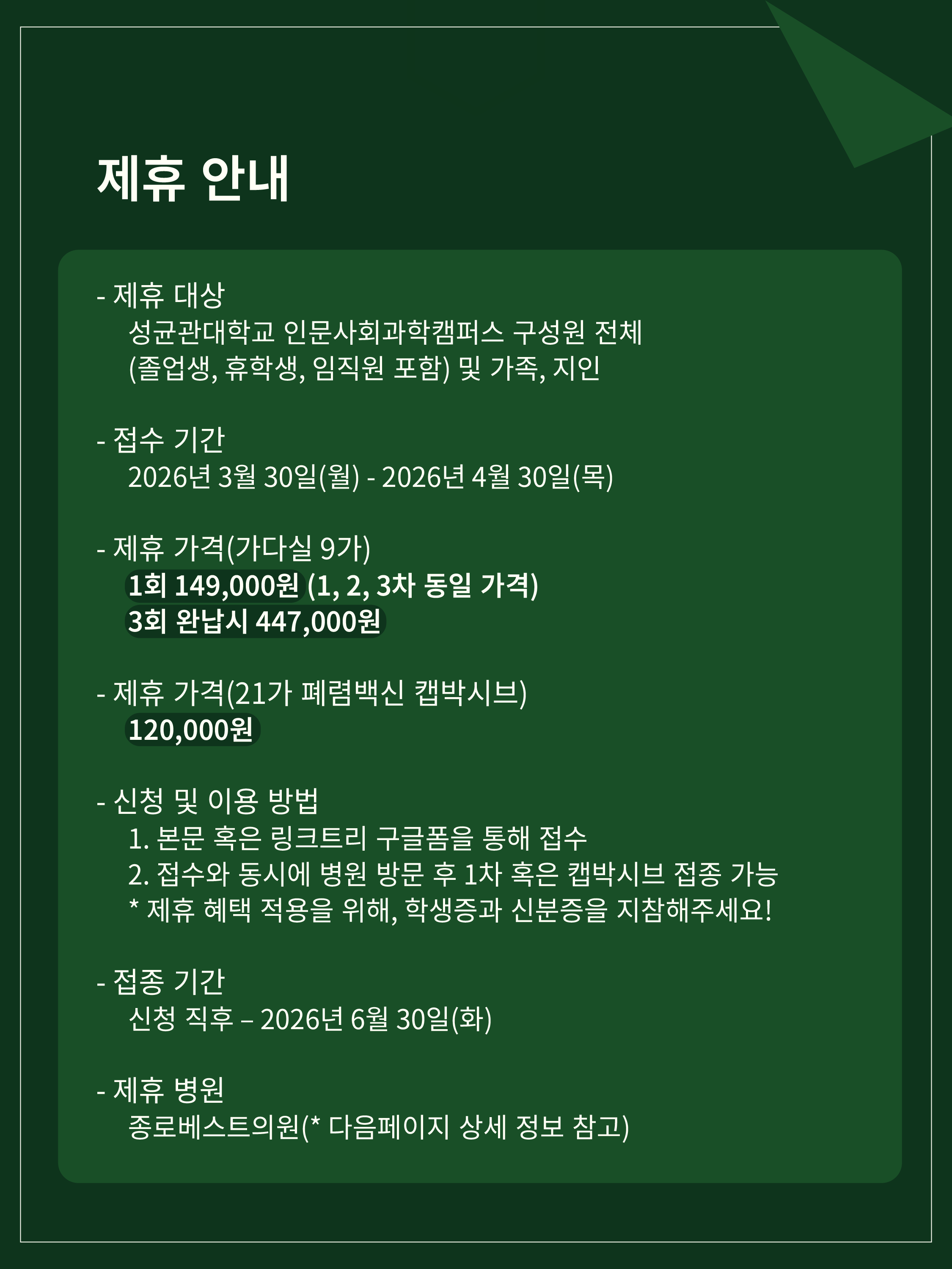 또한, 폐렴은 일상 속에서 누구에게나 발생할 수 있는 위험한 호흡기 질환인 만큼 예방이 중요한 질환입니다. 이를 위해 폐렴구균 백신인 캡박시브 역시 부담을 낮춘 가격으로 접종하실 수 있도록 함께 마련하였으니, 학우 여러분의 건강 관리에 도움이 되기를 바랍니다.