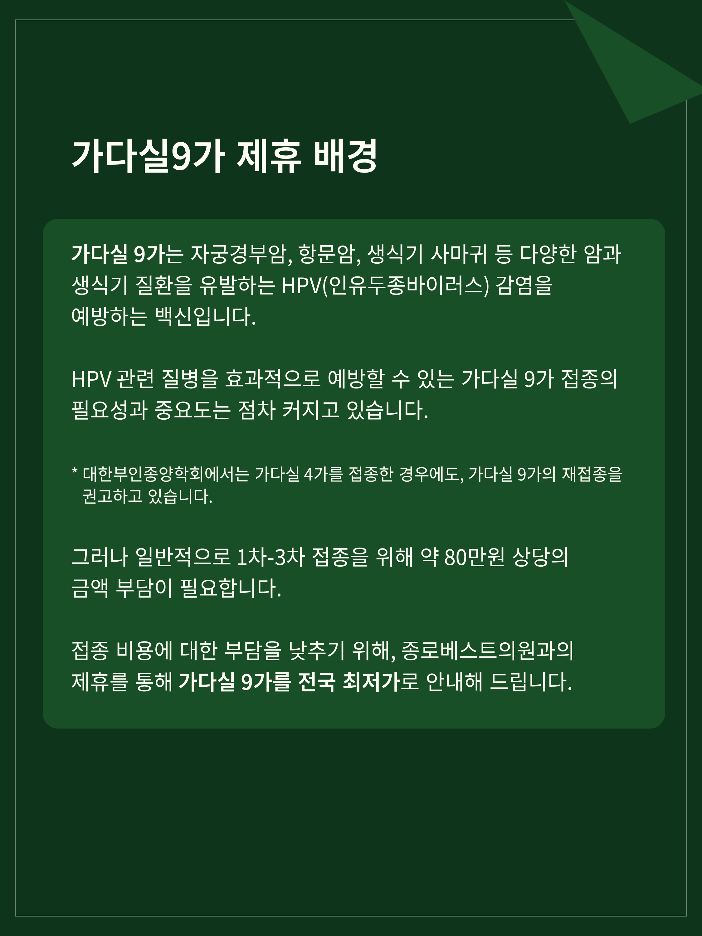 가다실 9가는 예방 효과와 필요성이 매우 높은 백신이지만, 1~3차에 걸친 접종 과정에서 적지 않은 비용이 발생해 학우 여러분께 부담으로 작용할 수 있습니다. 이에 S'PEAK는 종로베스트의원과의 제휴를 통해 보다 합리적인 비용으로 접종을 받으실 수 있도록 준비했습니다.