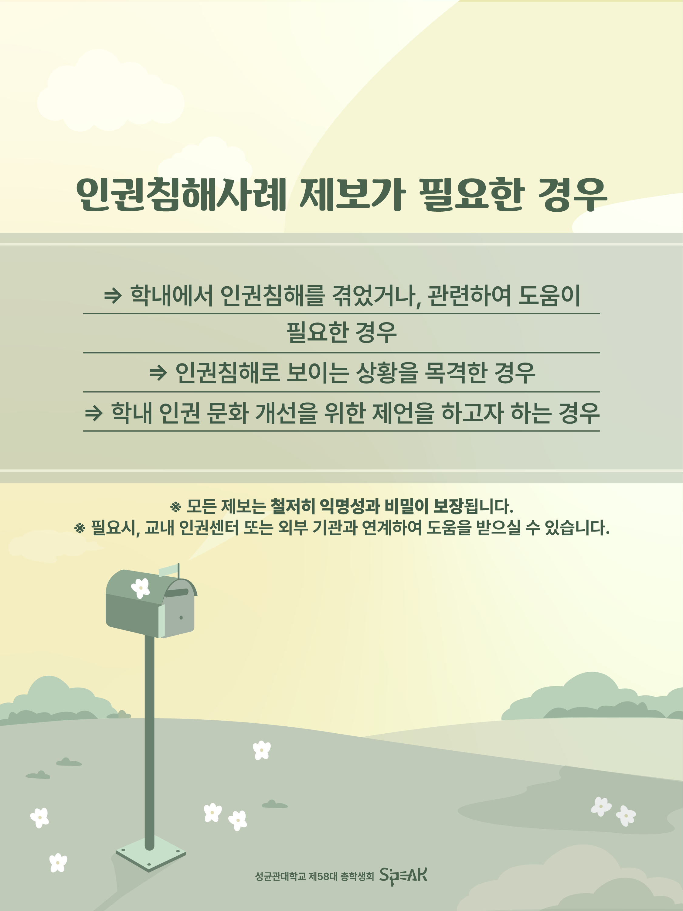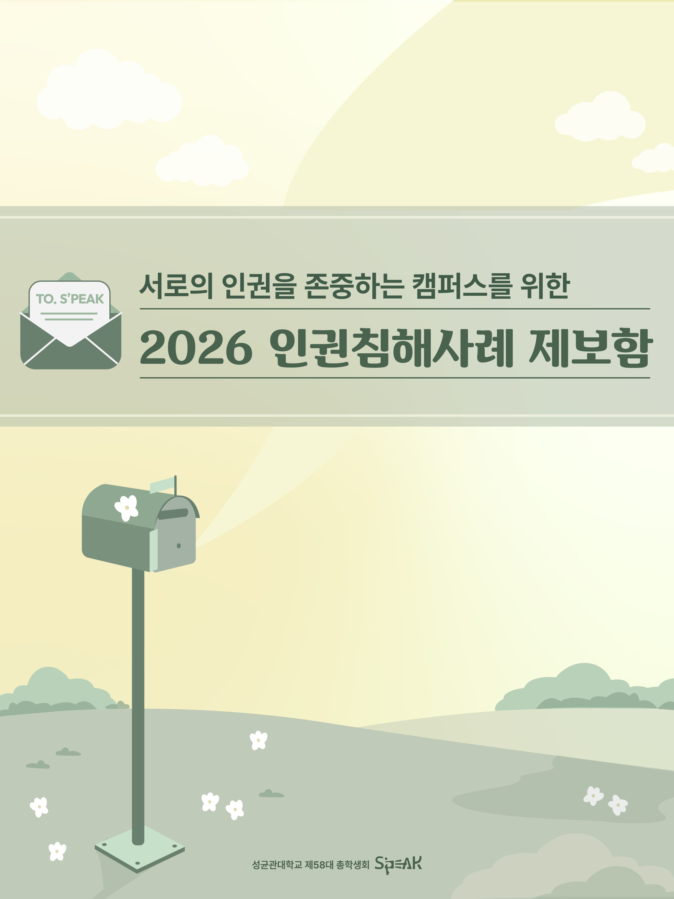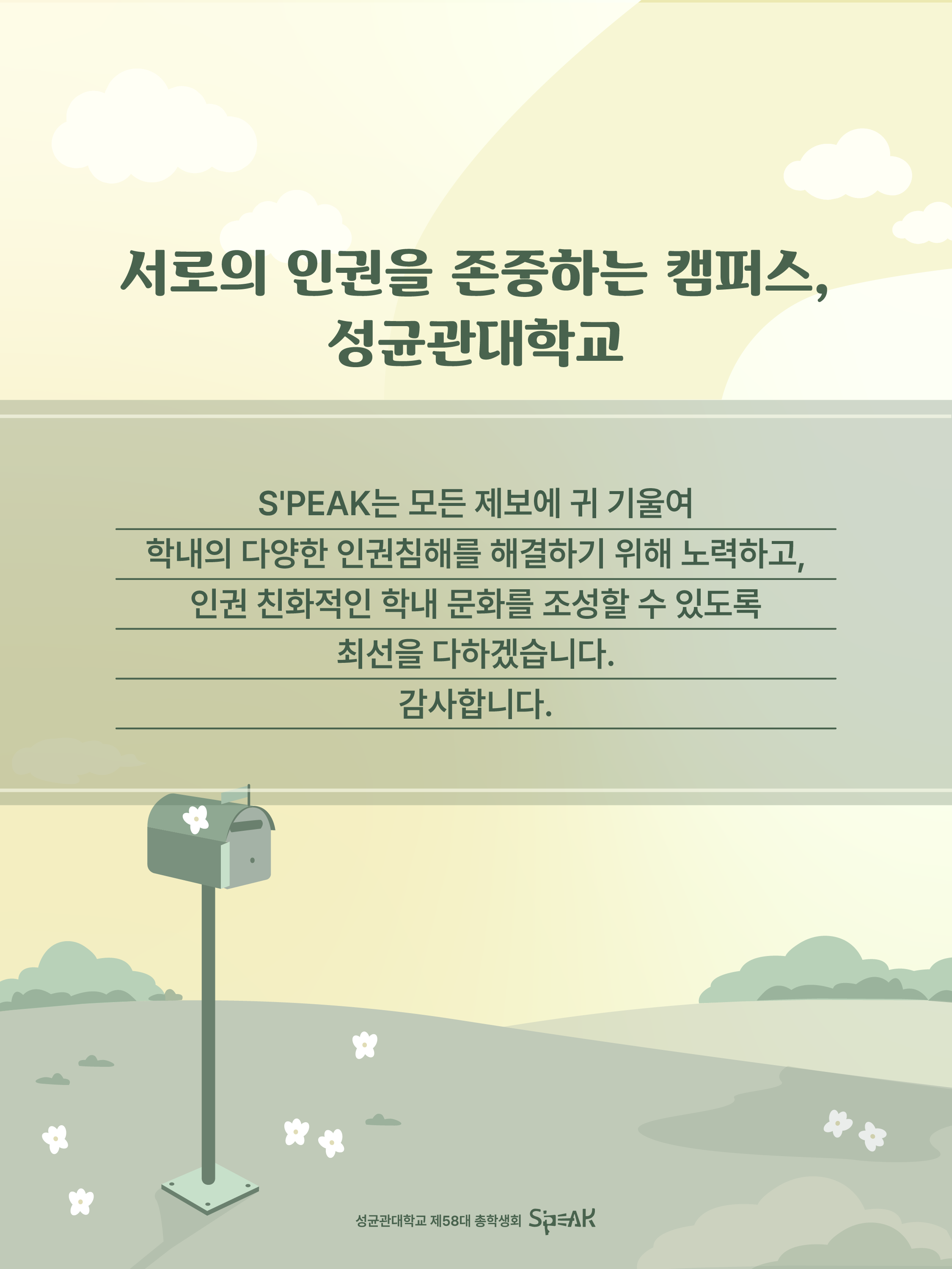 S'PEAK는 모든 제보에 귀 기울여 학내의 다양한 인권침해를 해결하기 위해 노력하고, 인권 친화적인 학내 문화를 조성할 수 있도록 최선을 다하겠습니다.