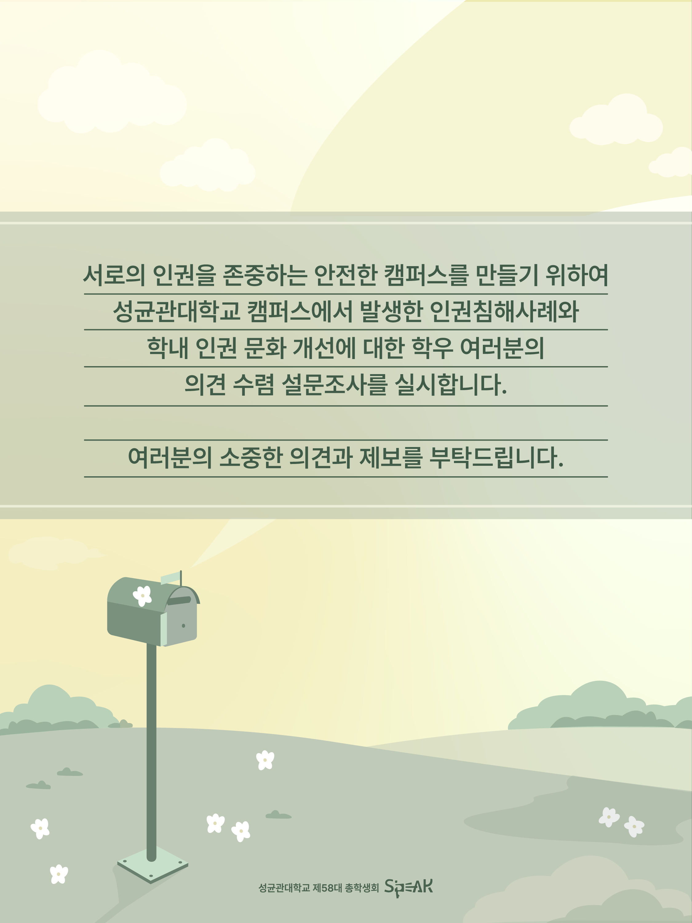 서로의 인권을 존중하는 안전한 캠퍼스를 만들기 위하여, 성균관대학교 캠퍼스에서 발생한 인권침해사례와 학내 인권 문화 개선에 대한 학우 여러분의 의견 수렴 설문조사를 실시합니다.