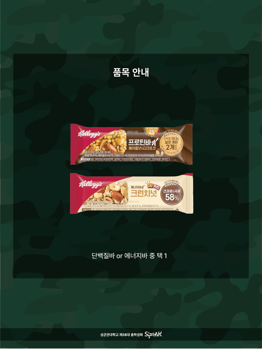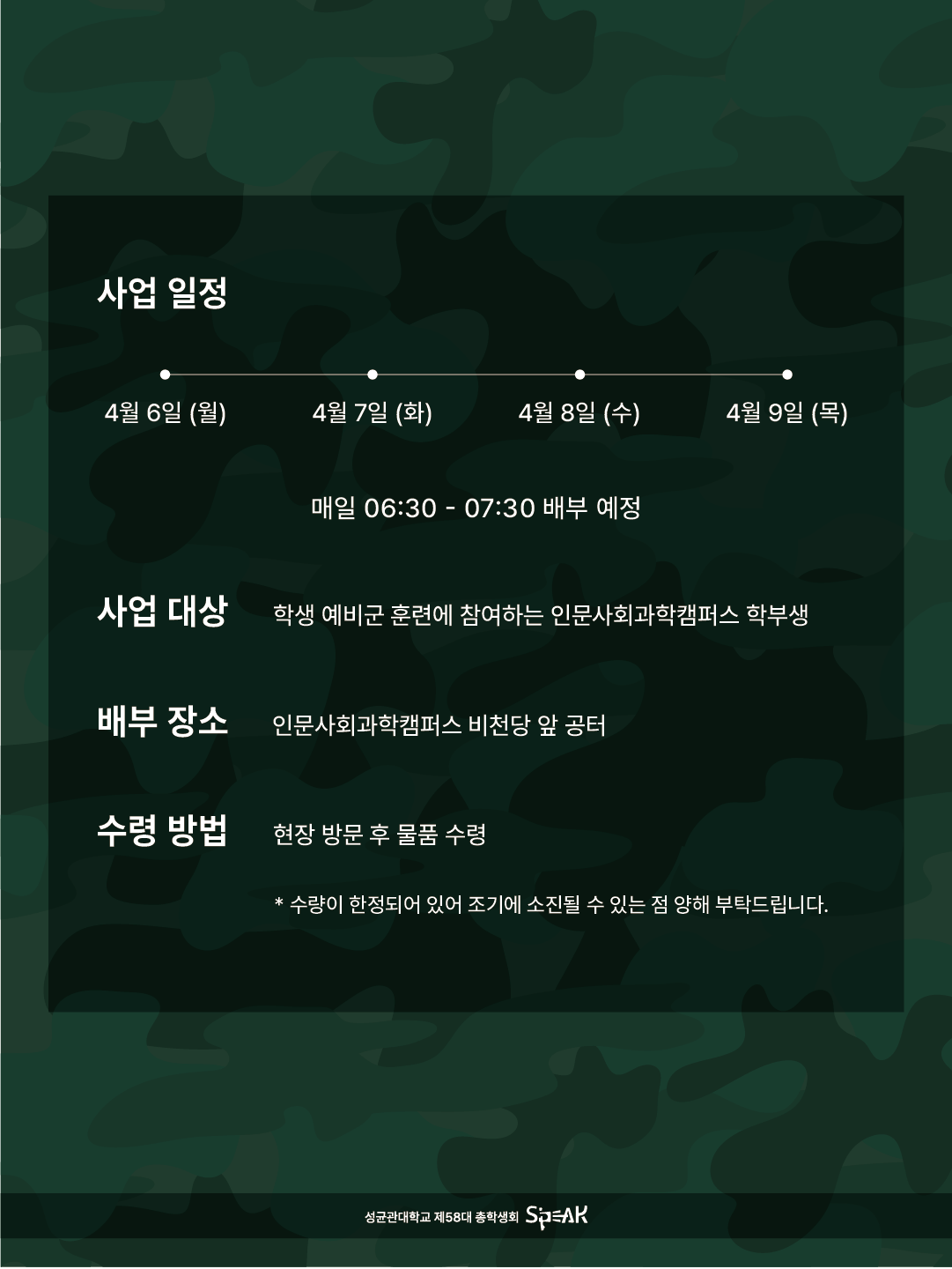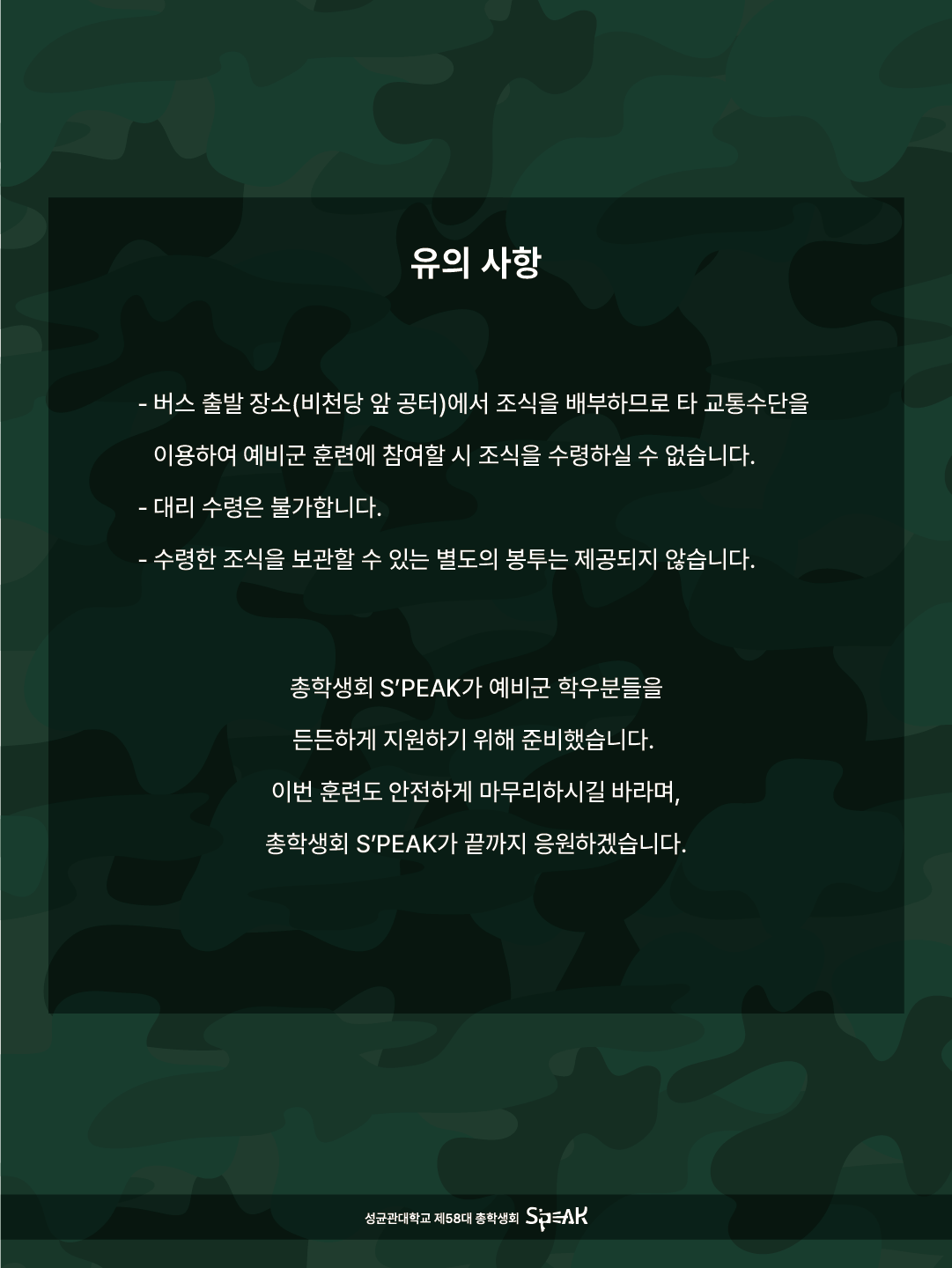 총학생회 S’PEAK가 예비군 학우분들을 든든하게 지원하기 위해 준비했습니다. 이번 훈련도 안전하게 마무리하시길 바라며, 총학생회 S’PEAK가 끝까지 응원하겠습니다.