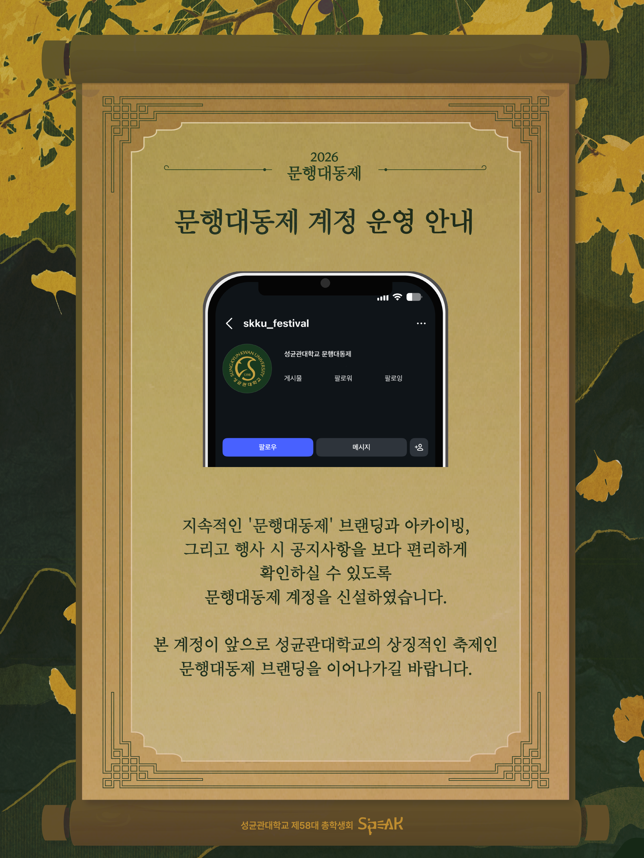 본 계정이 앞으로 성균관대학교의 상징적인 축제인 문행대동제 브랜딩을 이어나가길 바랍니다.