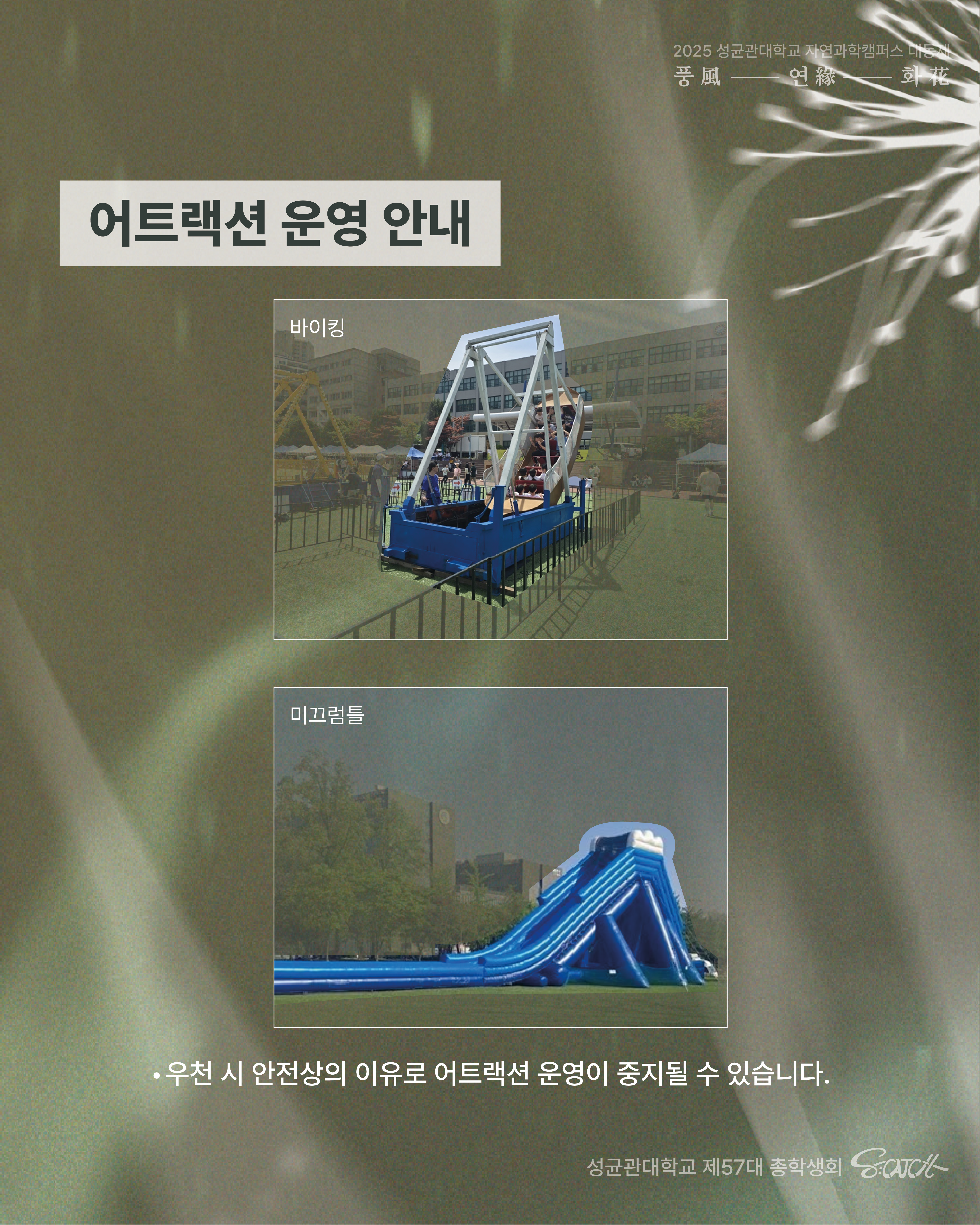 :우천 시 안전상의 이유로 어트랙션 운영이 중지될 수 있습니다.