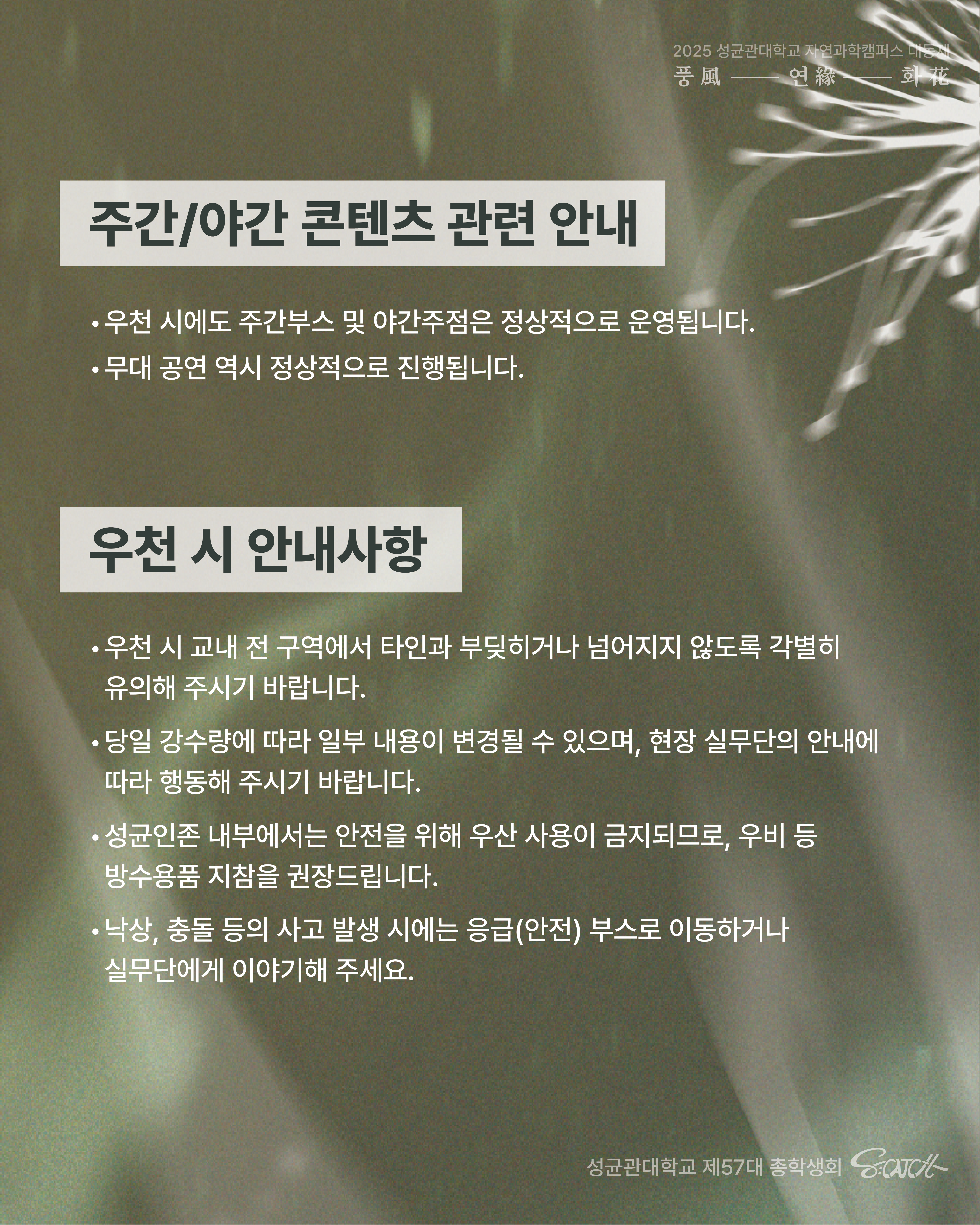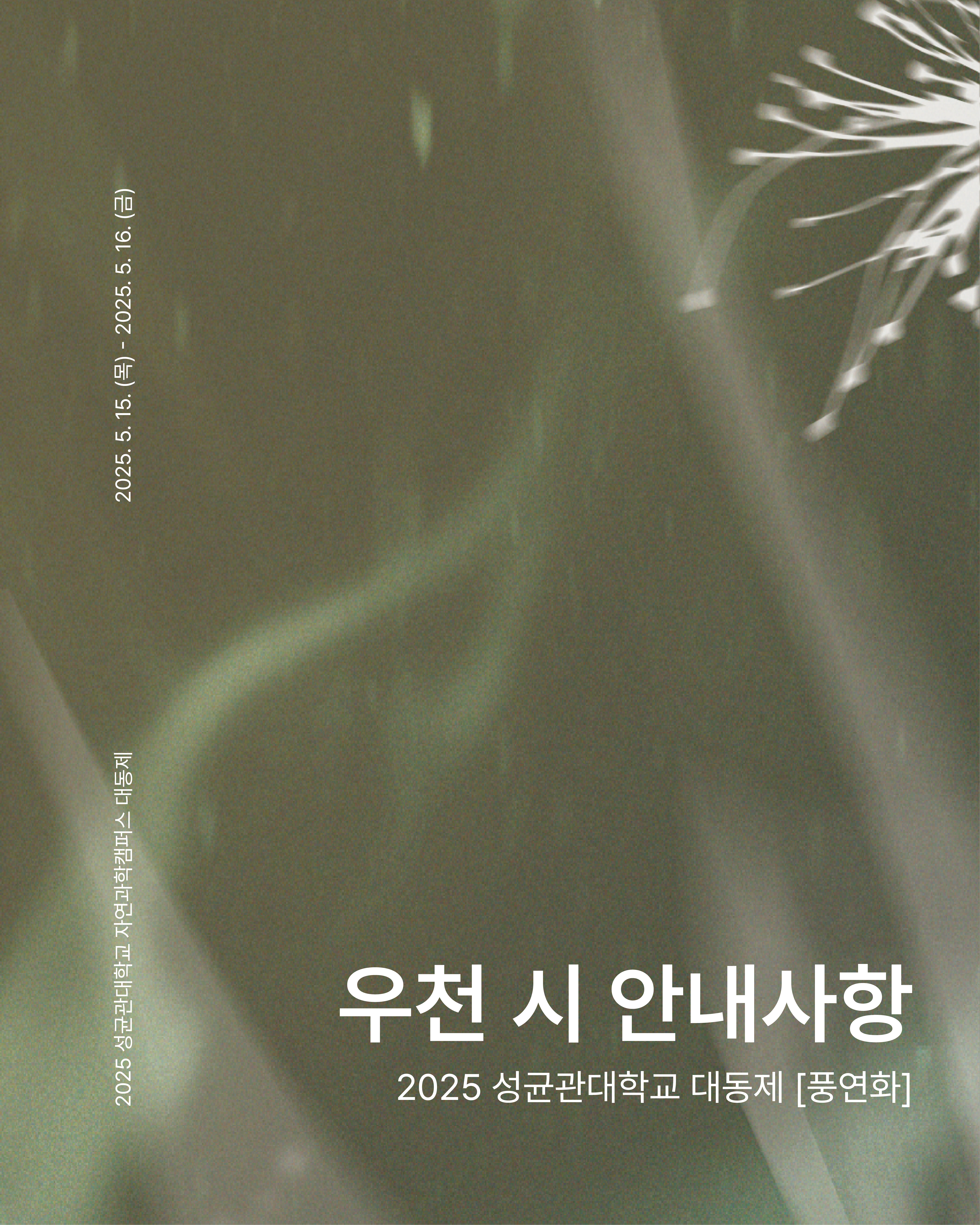 성균인존 내부에서는 안전을 위해 우산 사용이 금지되므로, 우비 등 방수용품 지참을 권장드립니다.
