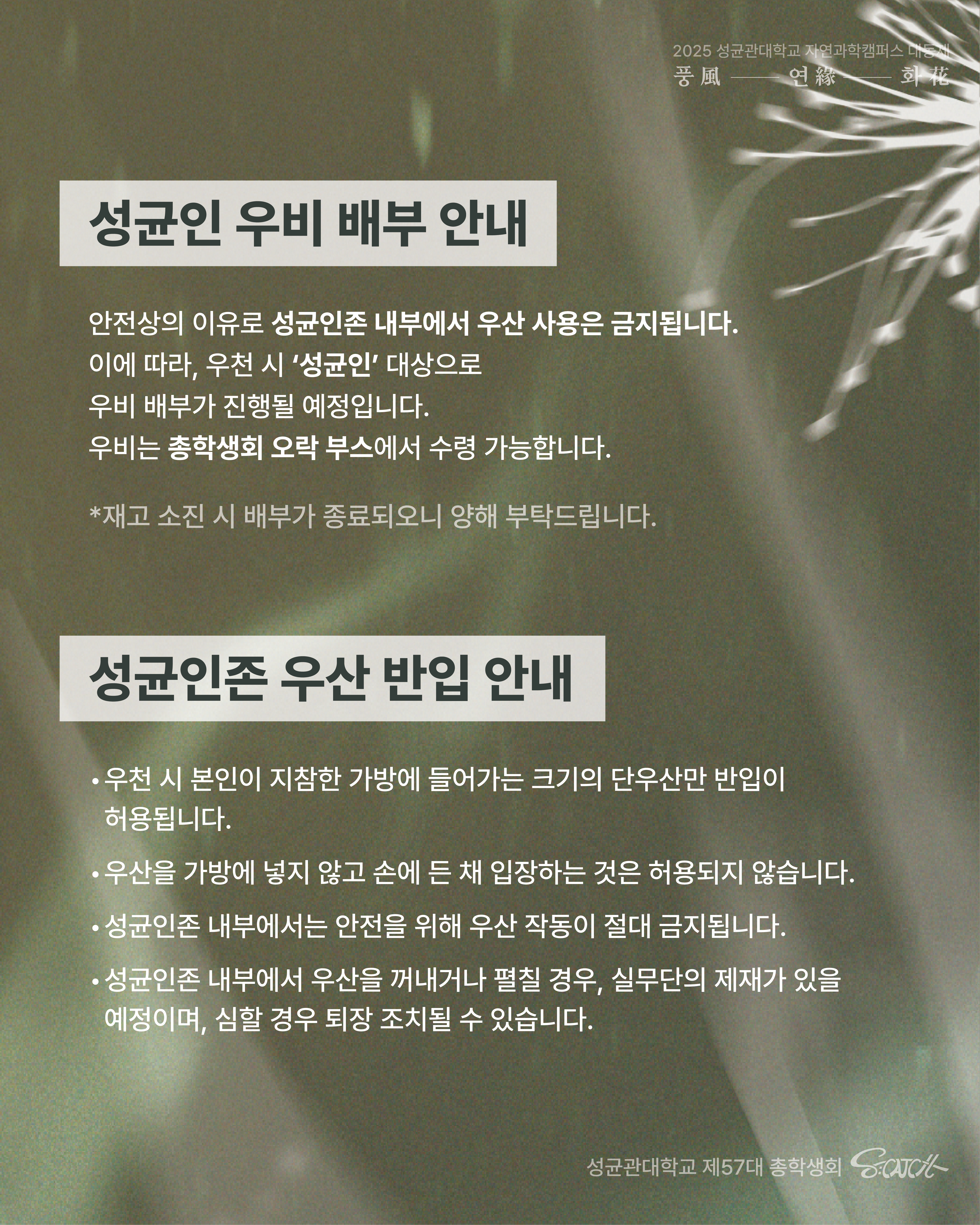 이에 따라, 우천 시 ‘성균인’ 대상으로 우비 배부가 진행될 예정입니다.