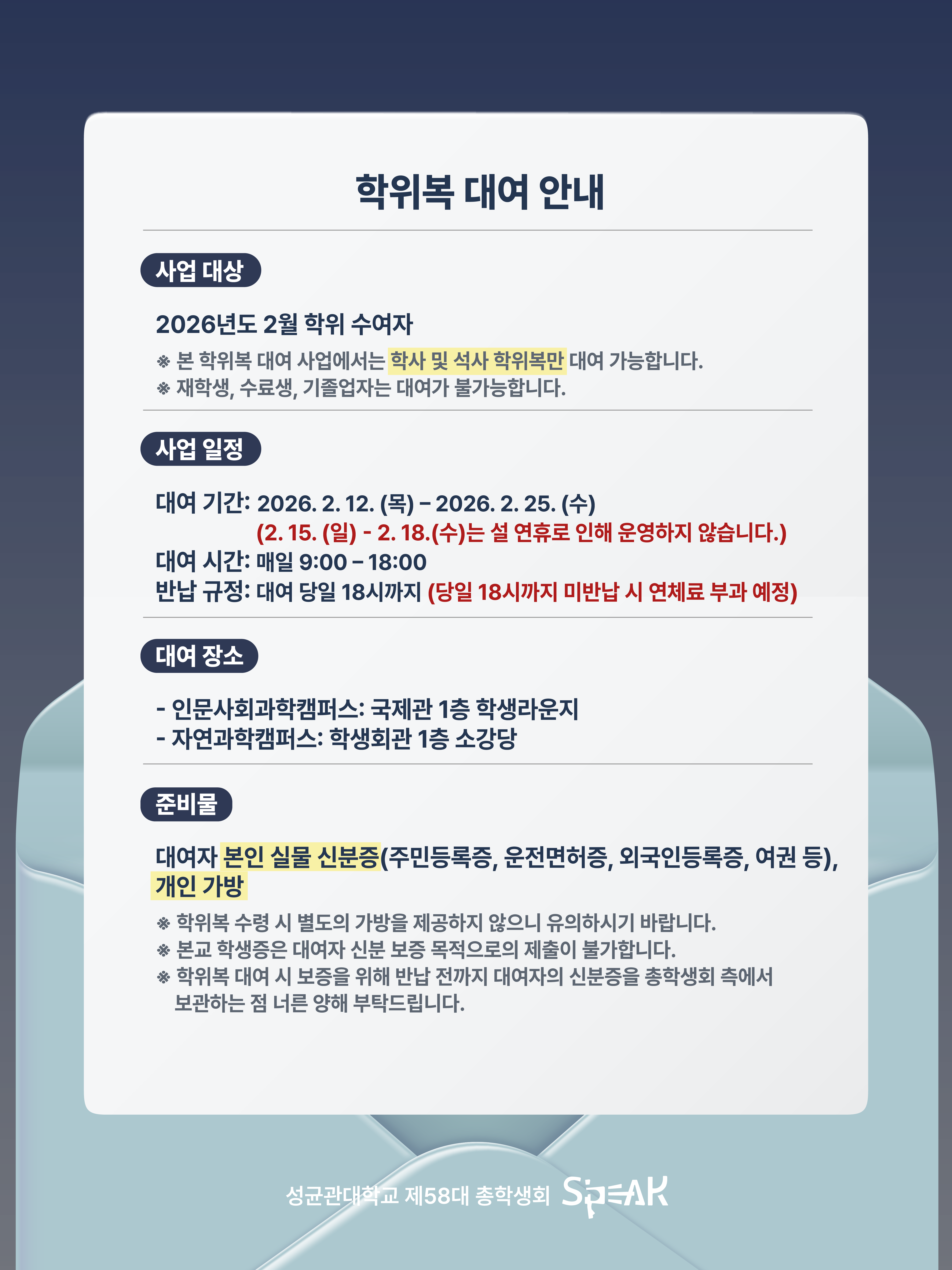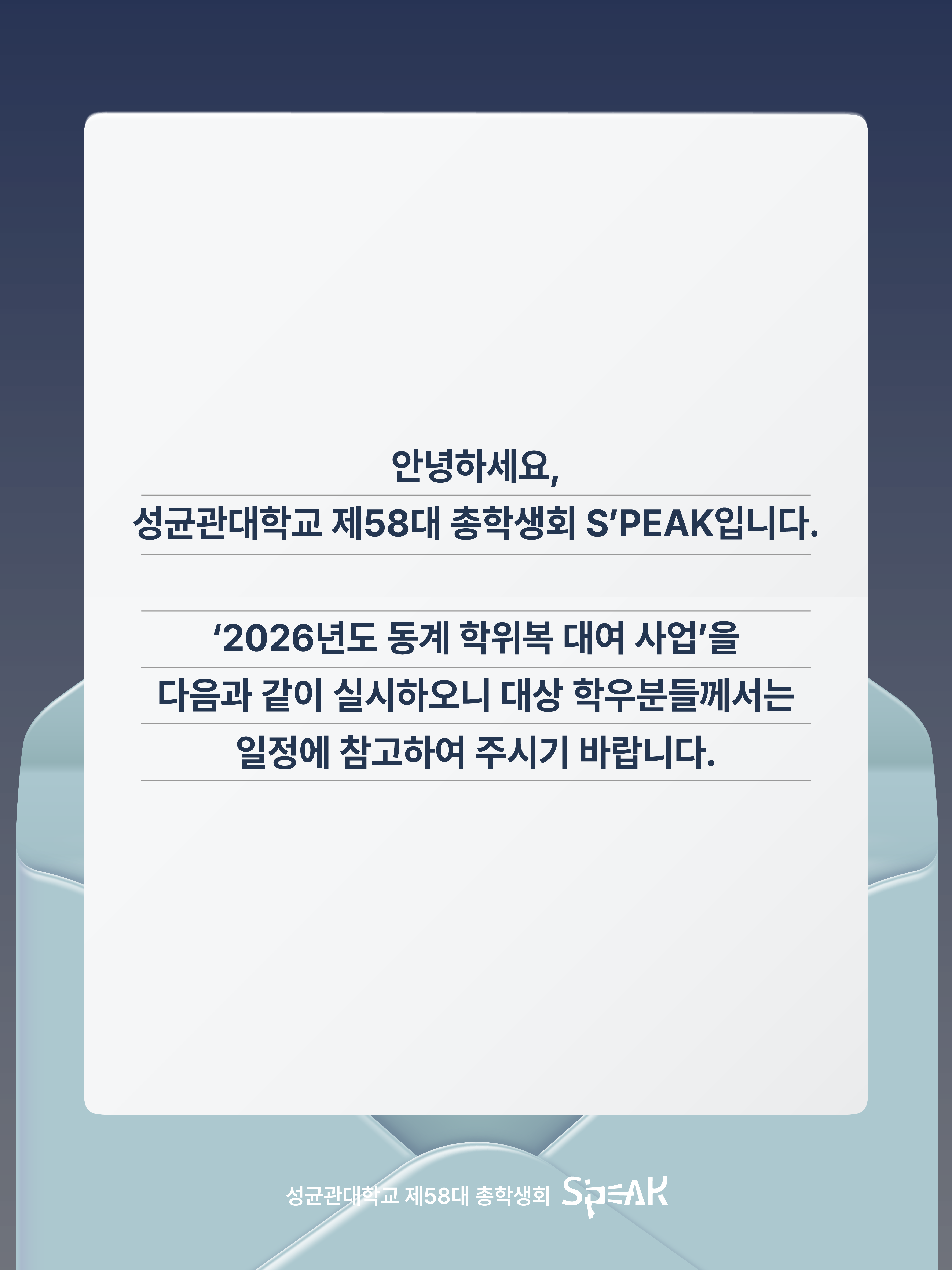 2026년도 동계 학위복 대여 사업을 다음과 같이 실시하오니 대상 학우분들께서는 일정에 참고하여 주시기 바랍니다.