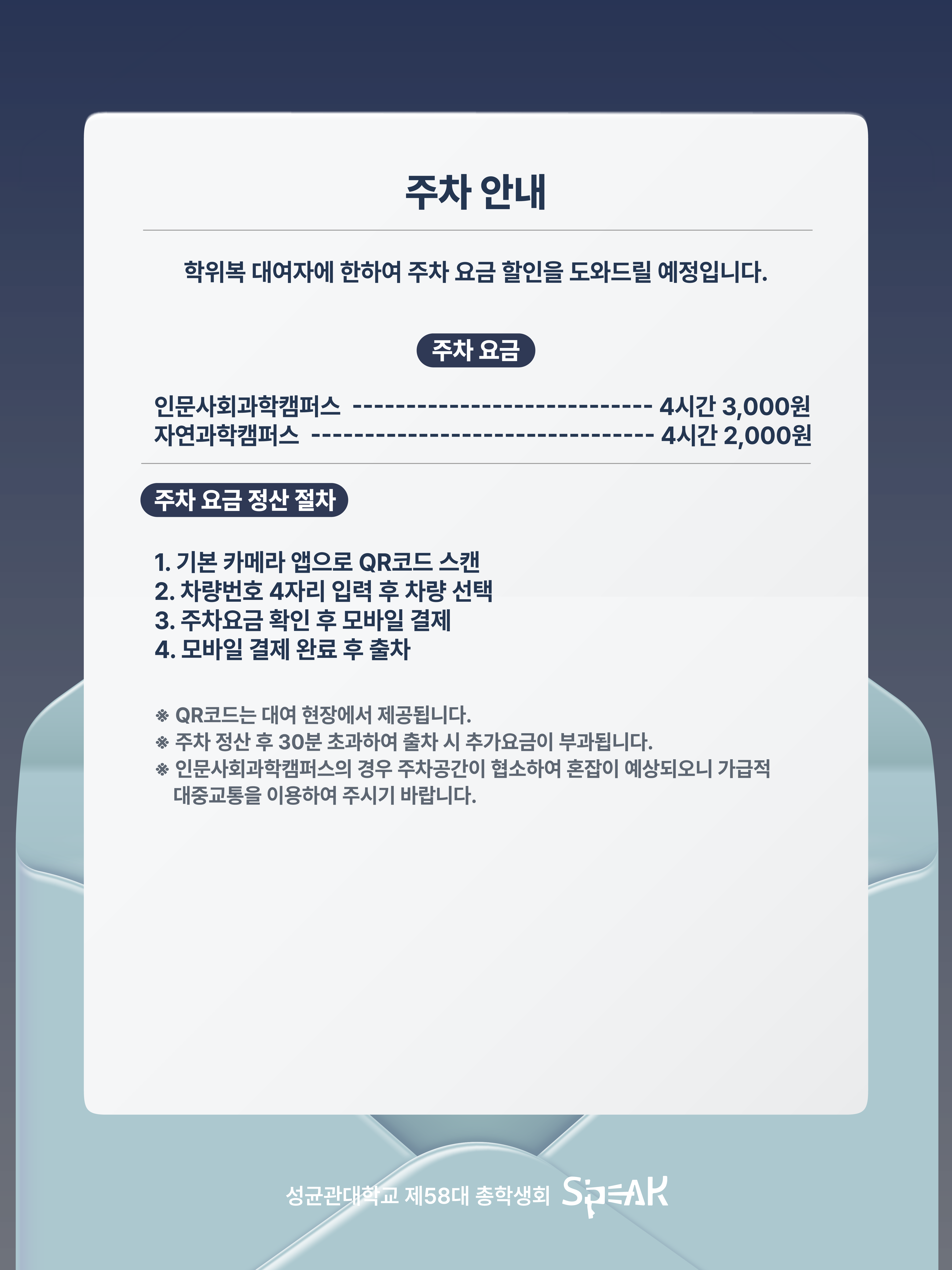 ○ 학위복 대여자에 한하여 주차 요금 할인을 도와드릴 예정입니다.