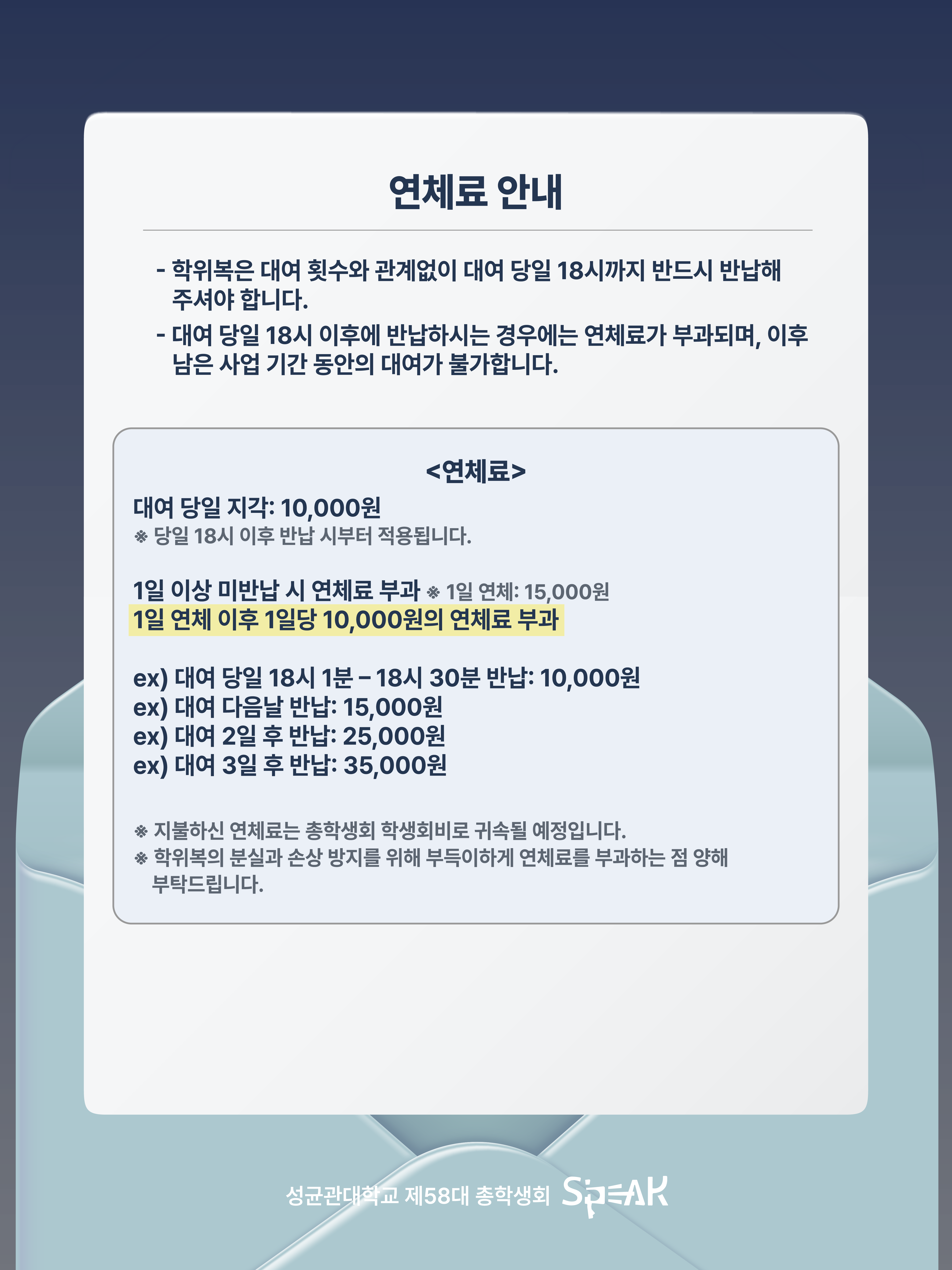○ 학위복 지각 반납 또는 미반납 시 이후 사업 기간 내 추가적인 대여가 불가합니다.