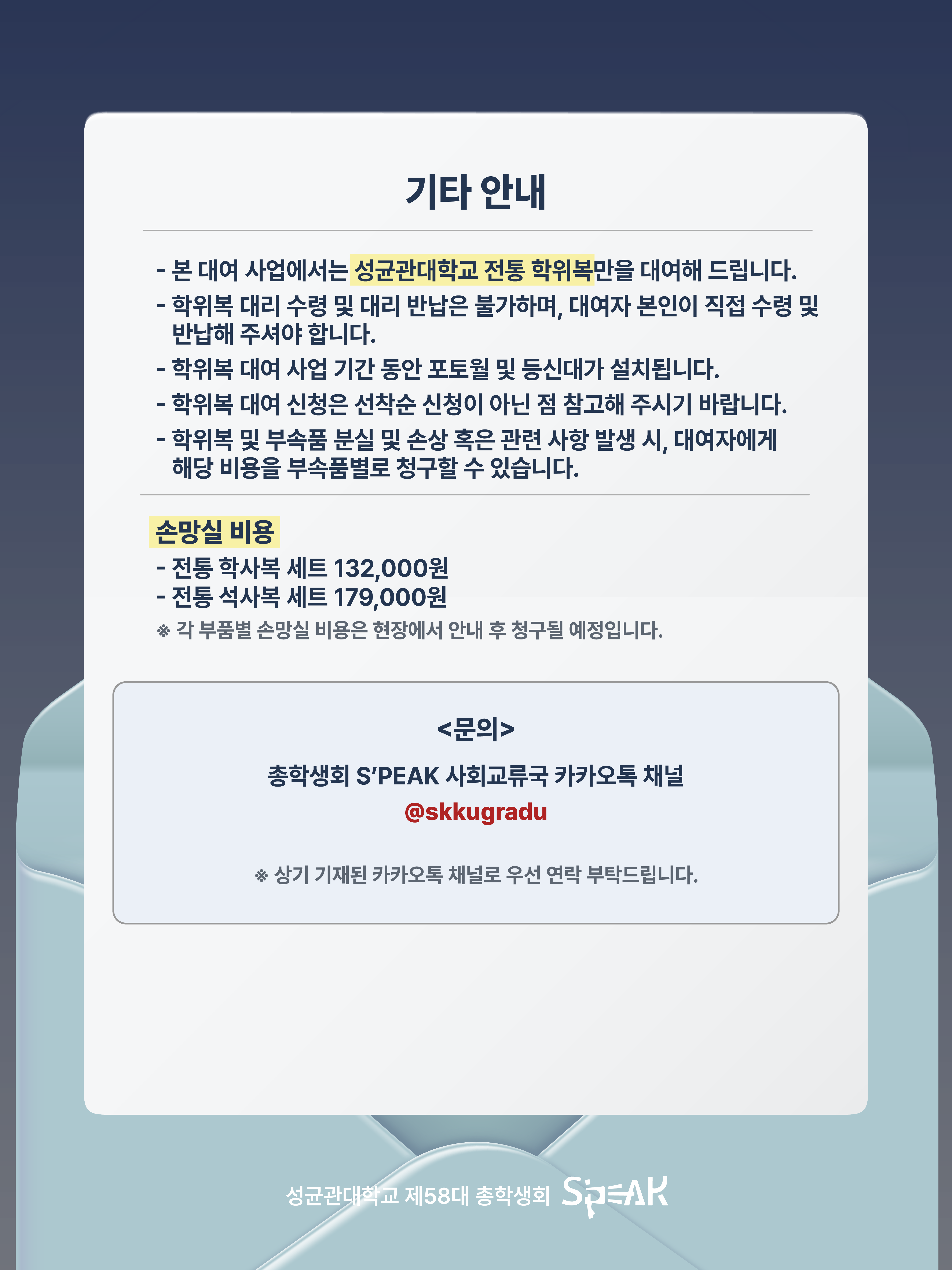 ※ A valid physical ID will be held by the SKKU Student Council until the graduation gown is returned.