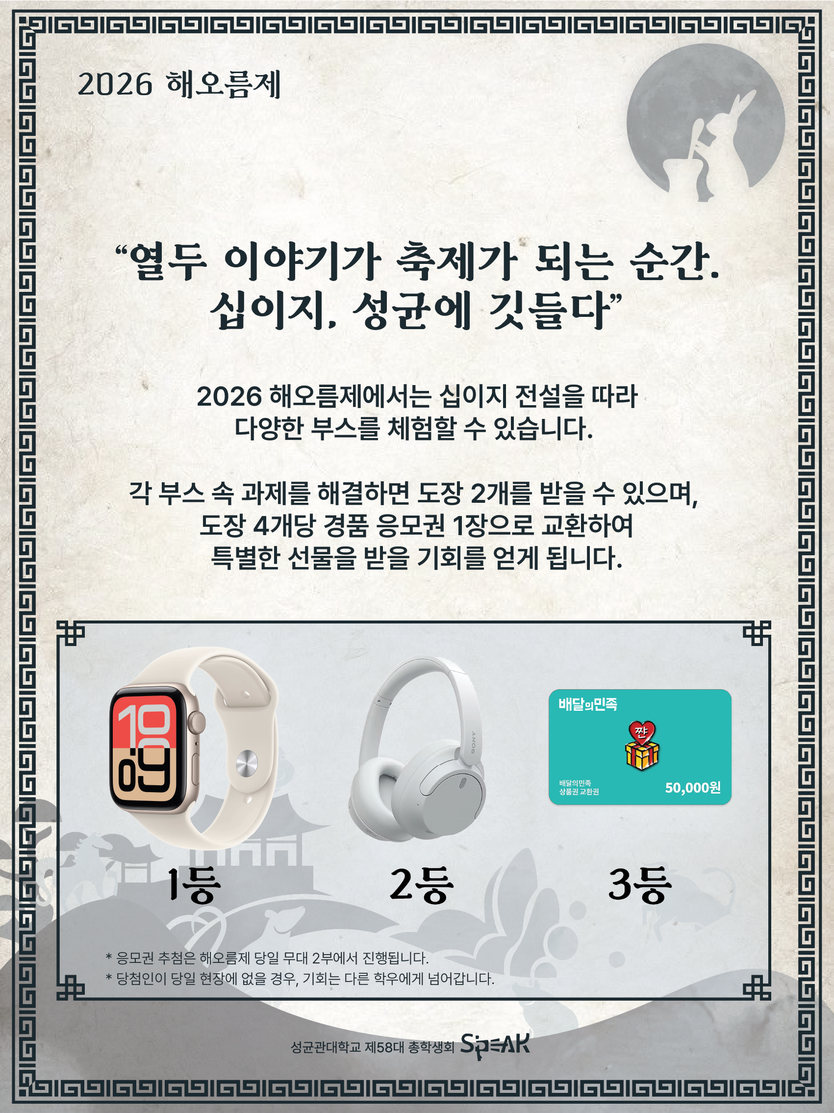 *십이지신 부스 응모권 추첨은 해오름제 당일 무대 2부에서 진행됩니다. 당첨자분이 당일 현장에 없으실 경우, 기회는 다른 학우들에게 넘어갑니다.