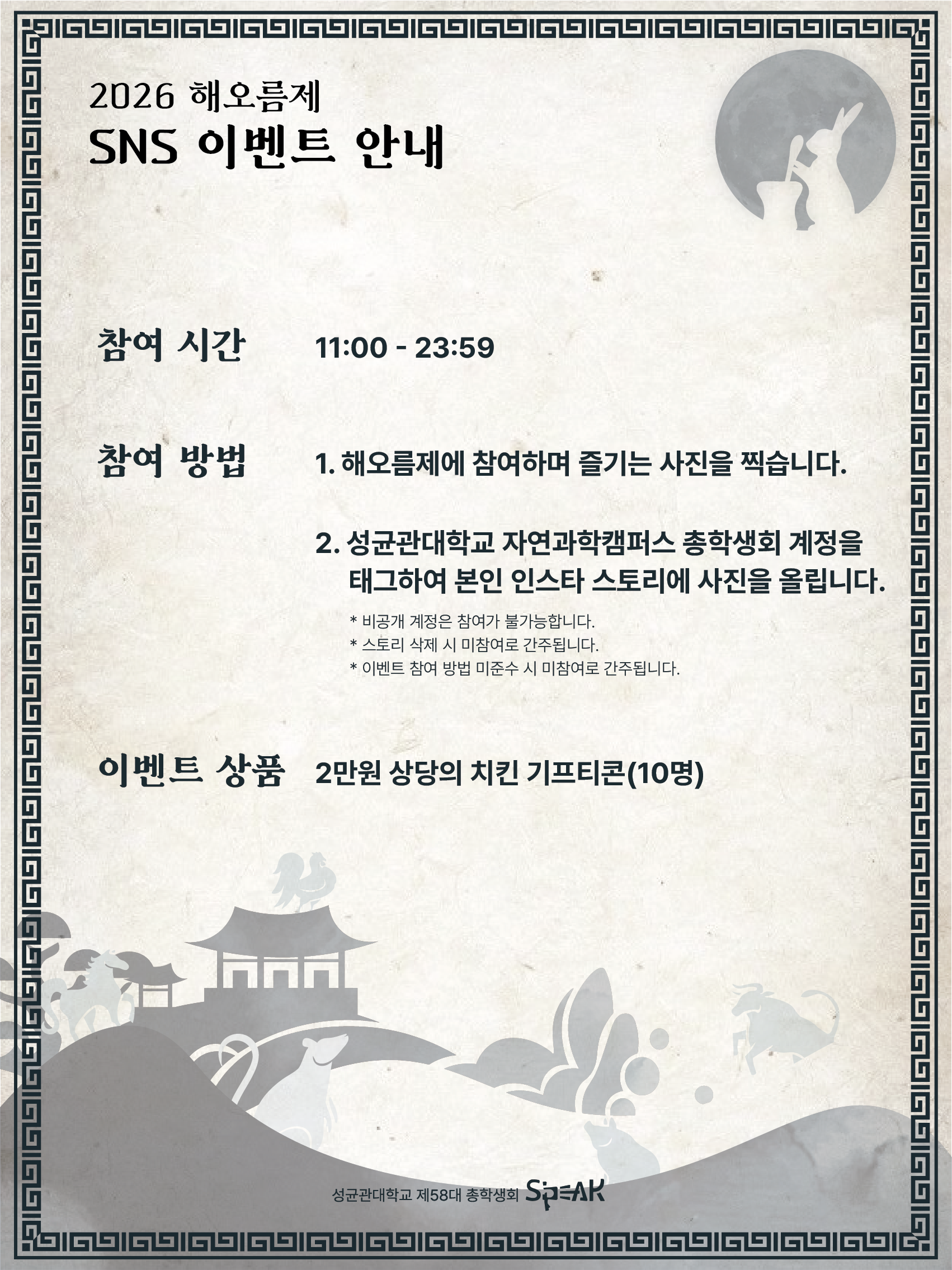 해오름제에 참여해 즐기는 사진을 찍어 인스타그램에 올려 SNS 이벤트에 참여하시면 10분에게 2만 원 상당의 치킨 기프티콘을 드립니다.