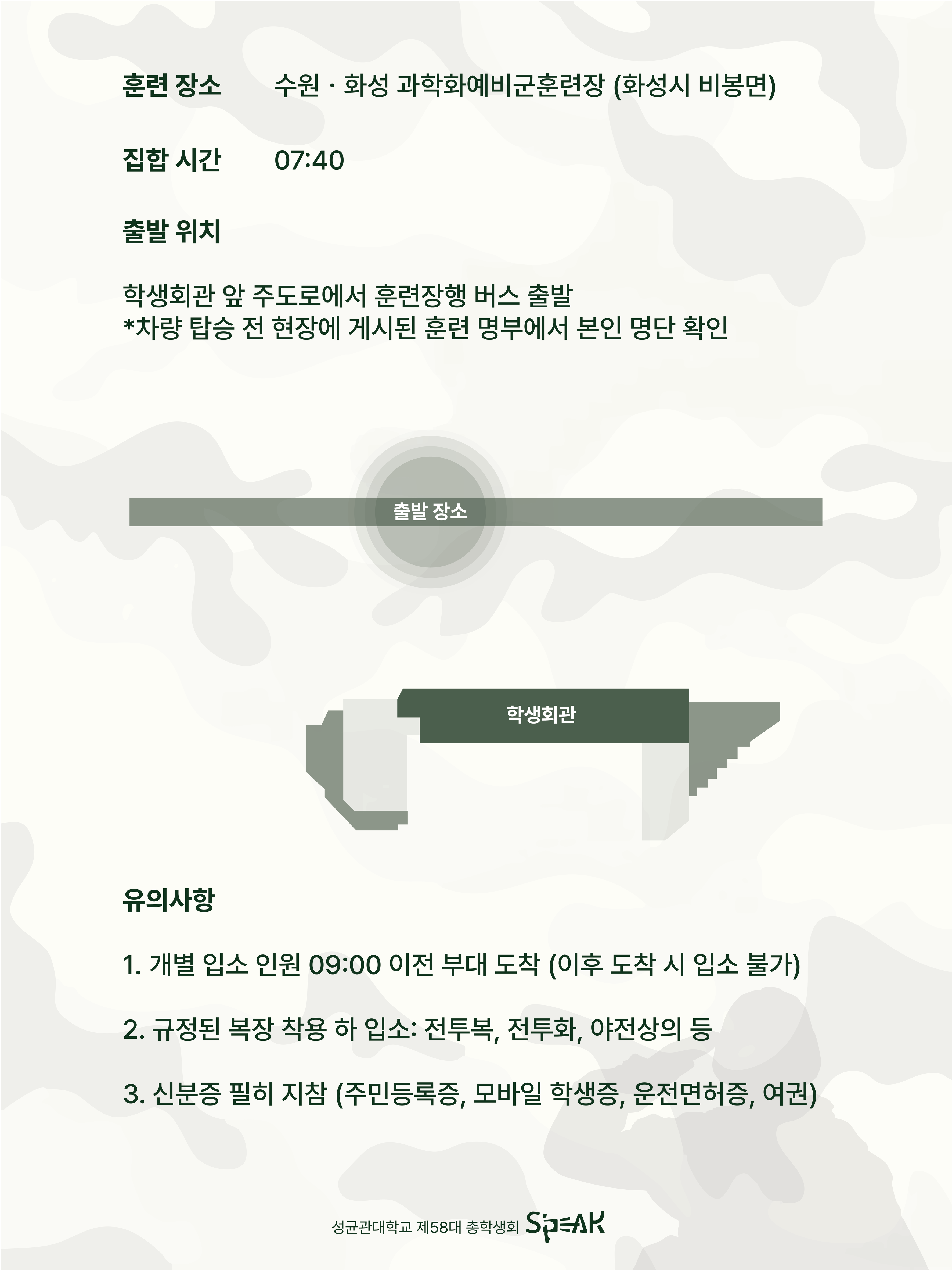 - 출발 장소 : 학생회관 앞 주도로에서 훈련장행 버스 출발