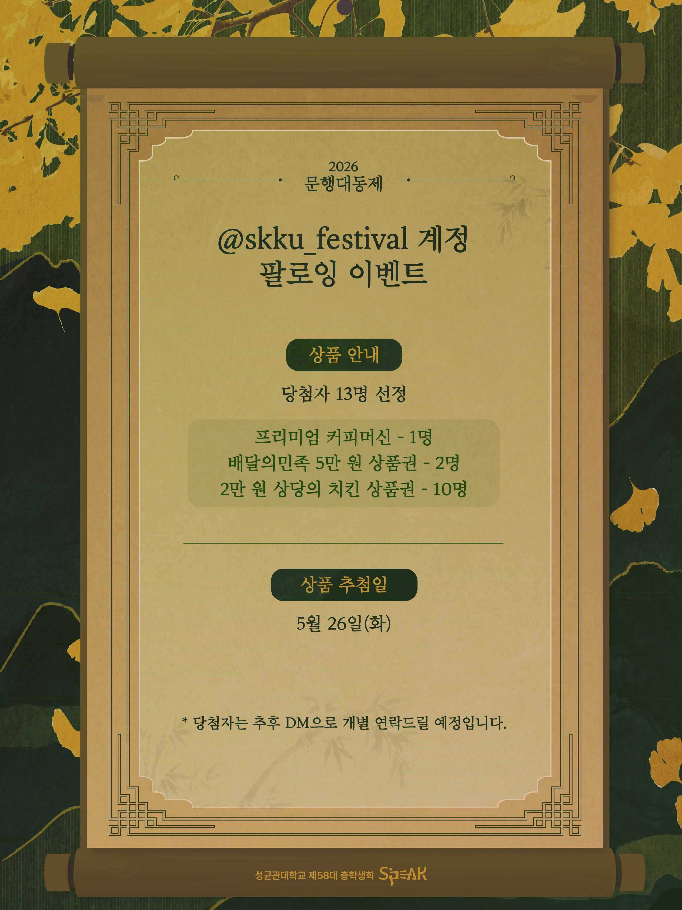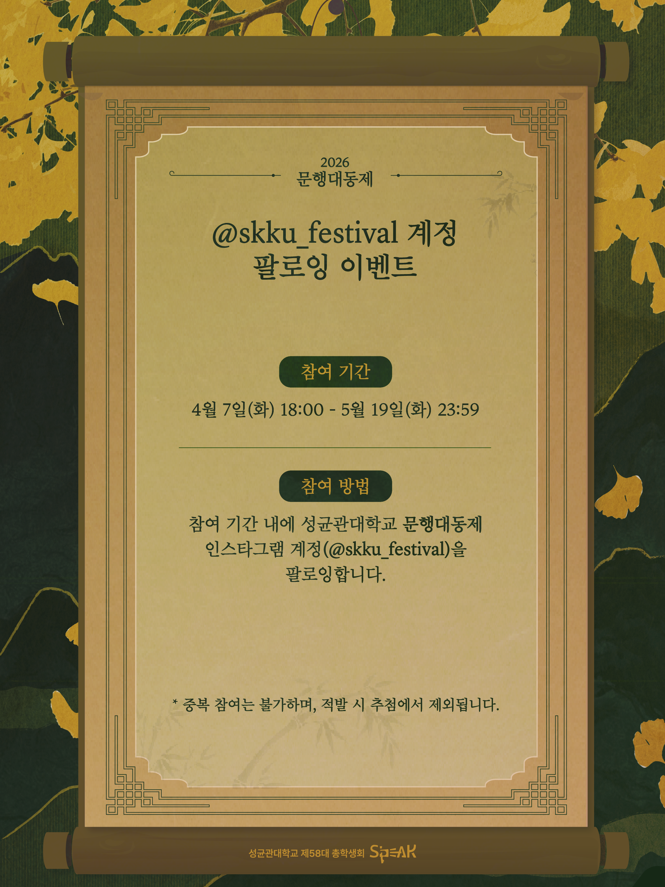 참여 기간 내에 성균관대학교 문행대동제(@skku_festival) 인스타그램 계정을 팔로잉합니다.